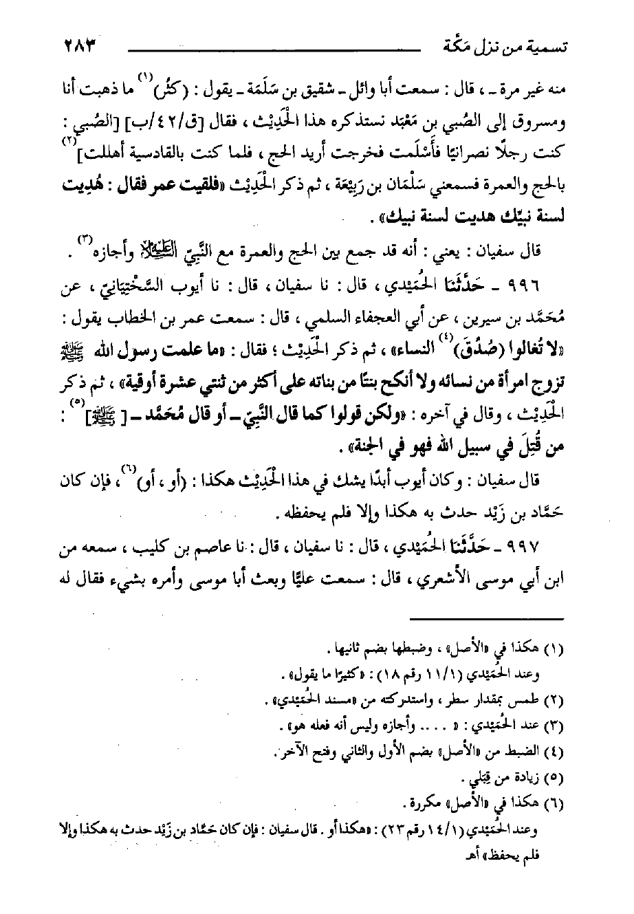 ٩٩٦- حَدَّثَنا الحُمَيْدي, قال: حدثنا سفيان, قال: حدثنا أَيُّوبُ السَّخْتِيَانِيّ, عَنْ مُحَمَّد بْنِ سيرين, عن أبي العجفاء السُّلَمِيِّ, قَالَ: سَمِعْتُ عُمَرَ بْنَ الْخَطَّابِ يَقُولُ: "لا تُغالوا (صُدُقَ النِّسَاءِ", ثُمَّ ذَكَرَ الْحَدِيْث؛ فَقَالَ: ما علمت رَسُولَ اللَّهِ صَلَّى اللَّهُ عَلَيْهِ وسلم تَزَوَّجَ امْرَأَةً مِنْ نِسَائِهِ وَلا أَنْكَحَ بِنْتًا مِنْ بَنَاتِهِ عَلَى أَكْثَرَ مِنْ ثِنْتَيْ عَشْرَةَ أُوقِيَّةً", ثُمَّ ذَكَرَ الْحَدِيْث, وَقَالَ فِي آخِرِهِ: "وَلَكِنْ قُولُوا كَمَا قَالَ النَّبِيّ، أَوْ قَالَ مُحَمَّد - صَلَّى اللَّهُ عَلَيْهِ وَسَلَّمَ: مَنْ قُتِلَ فِي سَبِيلِ اللَّه فَهُوَ فِي الْجَنَّةِ.