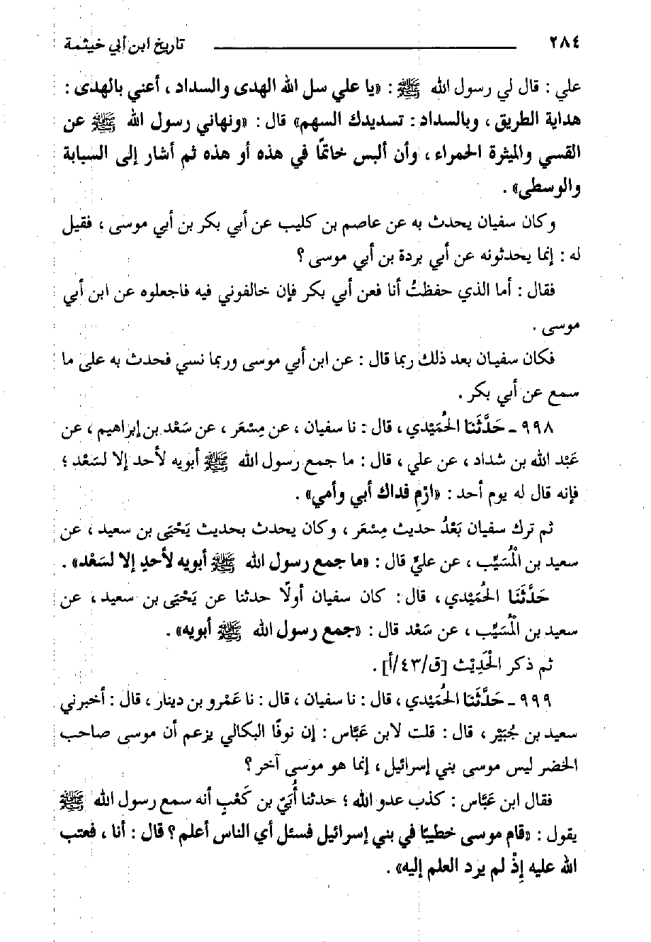 ٩٩٩- حَدَّثَنا الحُمَيْدي, قال: حدثنا سفيان, قال: حدثنا عَمْرو بْنُ دِينَارٍ, قَالَ: أَخْبَرَنِي سَعِيدُ بْنُ جُبَيْر, قَالَ: قُلْتُ لابْنِ عَبَّاس: إِنَّ نَوْفًا الْبِكَالِيَّ يَزْعُمُ أَنَّ مُوسَى صَاحِبُ الْخِضْرِ لَيْسَ مُوسَى بَنِي إِسْرَائِيلَ, إِنَّمَا هُوَ مُوسَى آخَرُ؟ فَقَالَ ابْنُ عَبَّاس: كَذَبَ عَدُوَّ اللَّهِ؛ حَدَّثَنَا أُبَيّ بْنُ كَعْبٍ أَنَّهُ سَمِعَ رَسُولَ اللَّهِ صَلَّى اللَّهُ عَلَيْهِ وَسَلَّمَ يَقُولُ: "قَامَ مُوسَى خَطِيبًا فِي بَنِي إِسْرَائِيلَ فَسُئِلَ أَيُّ الناس أعلم؟ قال: أخبرنا، فَعَتَبَ اللَّه عَلَيْهِ إِذْ لَمْ يَرُدَّ الْعِلْمَ إِلَيْهِ.