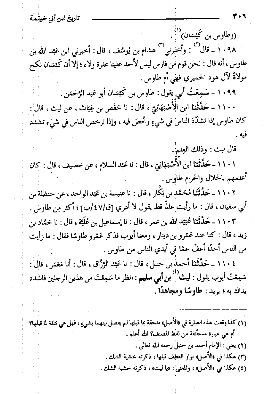 ١١٠١- حَدَّثَنا ابن الأَصْبَهَانِيّ، قال: حدثنا عَبْد السَّلامِ، عَنْ خصيف، قَالَ: كان أعلمهم بالحلال والحرام طاووس.