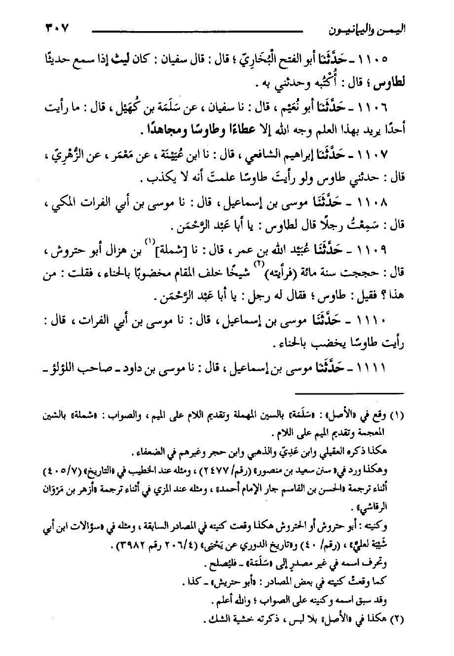 ١١١٠ - حَدَّثَنَا مُوسَى بْن إسماعيل, قال: حدثنا مُوسَى بْن أبي الفرات, قَالَ: رأيت طاوسًا يخضب بالحناء.