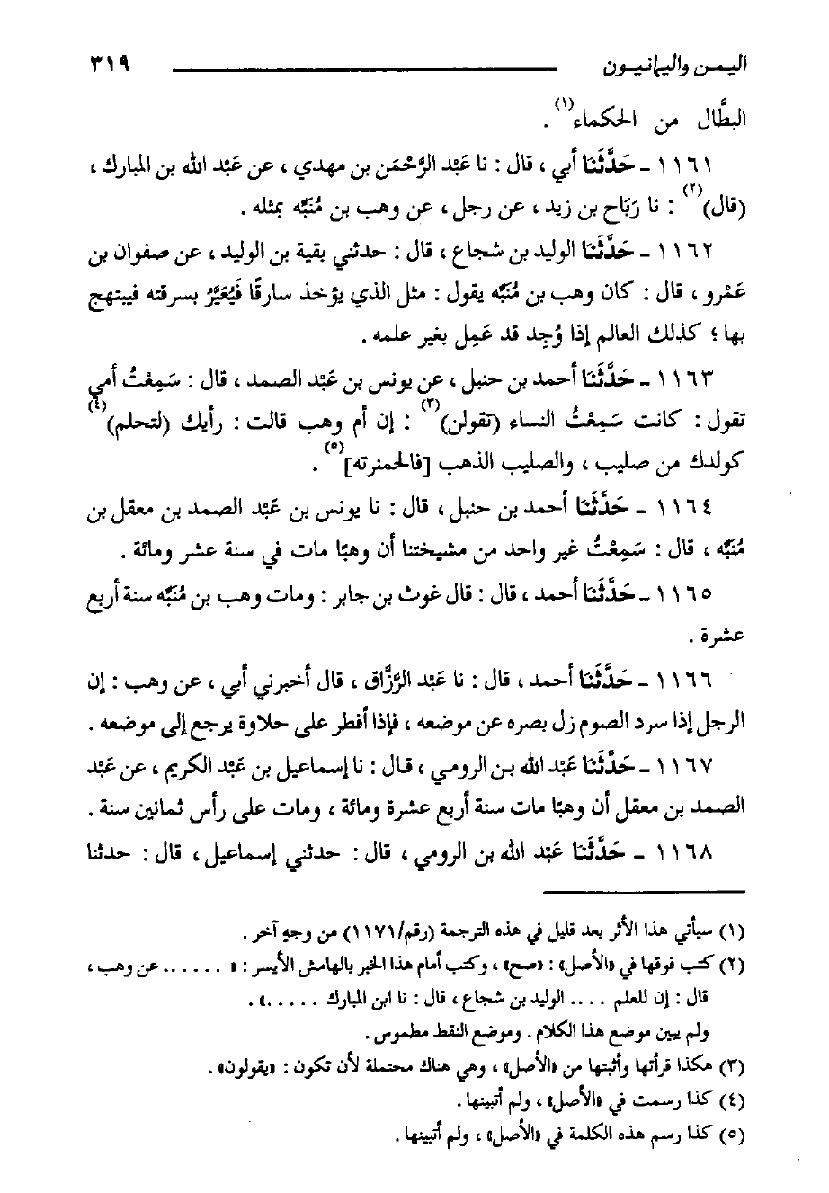 ١١٦٤- حَدَّثَنا أحمد بن حنبل، قال: حدثنا يُونُس بْن عَبْد الصمد بْن معقل بْن مُنَبِّه، قَالَ: سَمِعْتُ غير واحد من مشيختنا أن وهبًا مات فِي سنة عشر ومئة.