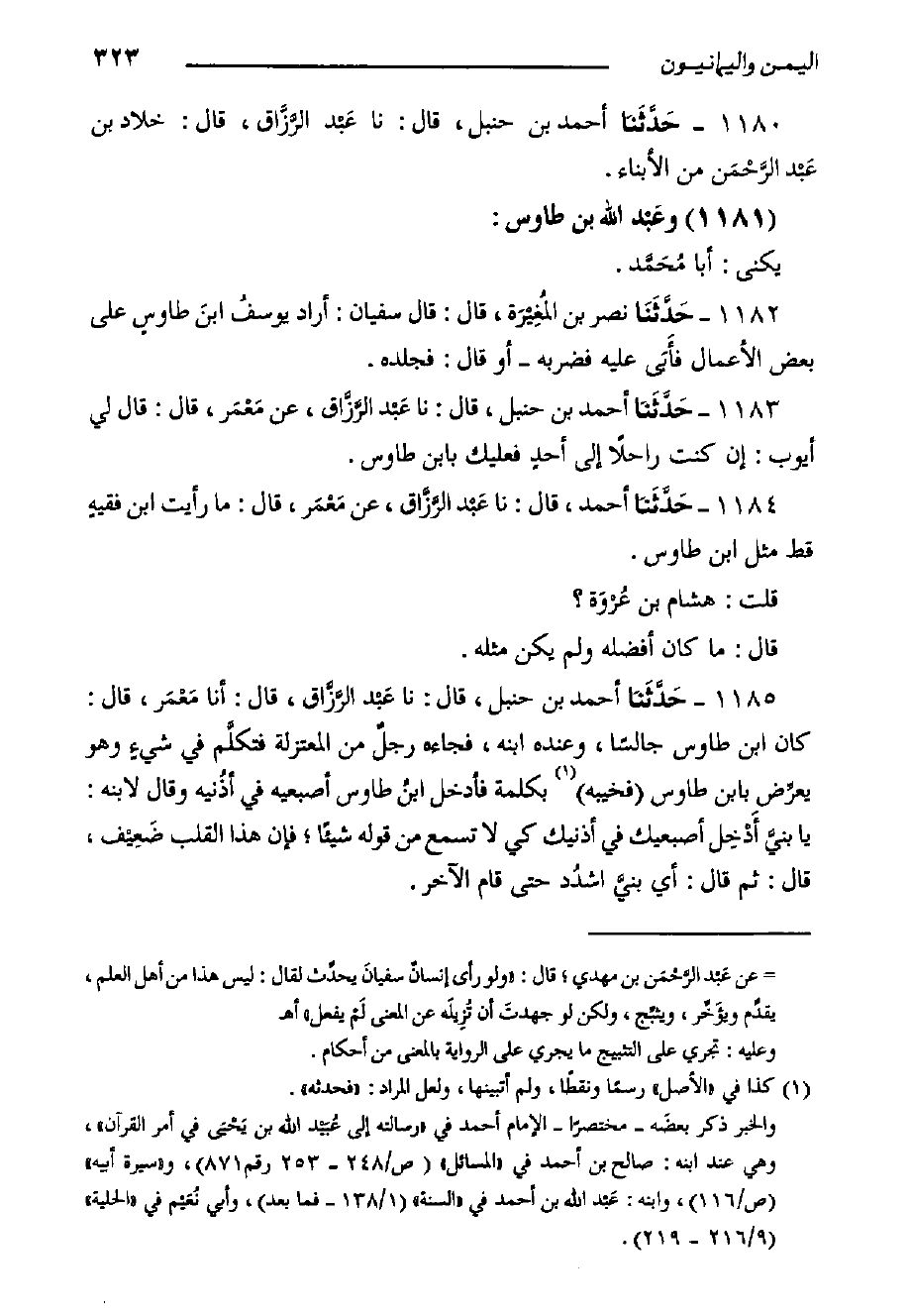 ١١٨٥- حَدَّثَنا أَحْمَدُ بْنُ حنبل، قال: حدثنا عَبْد الرَّزَّاق، قال: أخبرنا مَعْمَر، قال: كان ابن طاووس جالسًا, وعنده ابنه, فجاءه رجلٌ من المعتزلة فتكلَّم فِي شيءٍ وهو يعرِّض بابن طاووس فخيبه بكلمة فأدخل ابنُ طاووس إصبعيه فِي أذُنيه وَقَالَ لابنه: يَا بنيَّ أَدْخِل إصبعيك فِي أذنيك كي لا تسمع من قوله شيئًا؛ فإن هَذَا القلب ضَعِيْف، قَالَ: ثُمَّ قَالَ: أي بنيَّ اشدُد حَتَّى قام الآخر