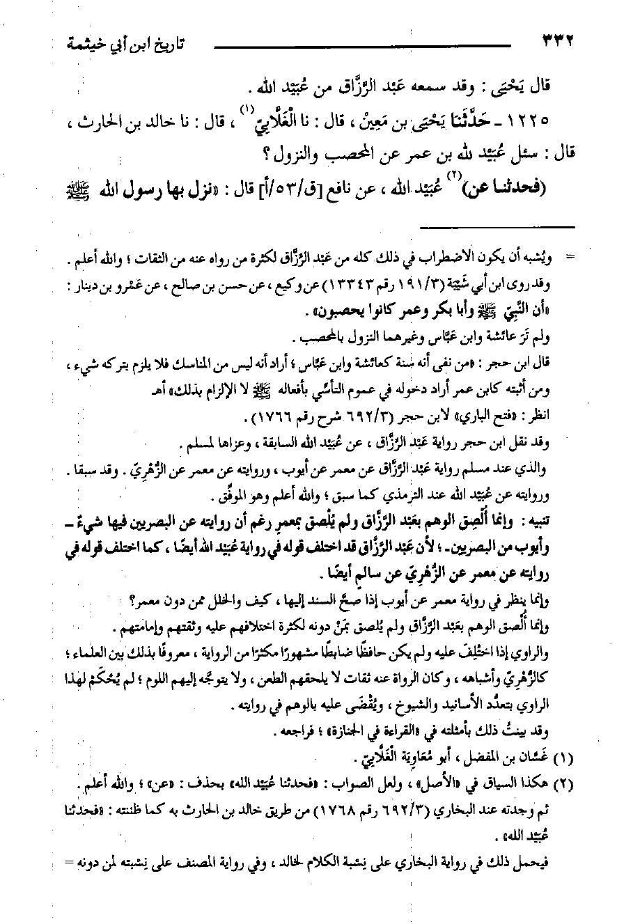 ١٢٢٥- حَدَّثَنا يَحْيَى بن مَعِيْن، قال: حدثنا الْغَلَاّبِيّ، قال: حدثنا خَالِدُ بْنُ الْحَارِثِ، قَالَ: سُئِلَ عُبَيْد لله بْنُ عُمَرَ عَنِ الْمُحَصَّبِ وَالنُّزُولِ؟ فَحَدَّثَنَا عَنْ عُبَيْد اللَّهِ، عَنْ نافع [ق/٥٣/أ] قَالَ: نَزَلَ بِهَا رَسُولُ اللَّهِ صلى الله عليه وسل