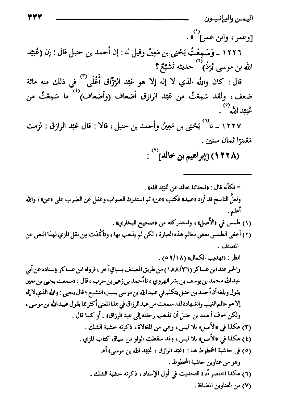 ١٢٢٦ - وَسَمِعْتُ يَحْيَى بْن مَعِيْن وقيل له: إن أَحْمَد بْن حنبل قَالَ: إن عُبَيْد اللَّهِ بْن مُوسَى يُرَدُّ حديثه تَشَيُّعٌ؟ قَالَ: كَانَ والله الذي لا إله إِلا هو عَبْد الرَّزَّاق أَغْلَى فِي ذلك منه مئة ضعف, ولقد سَمِعْتُ من عَبْد الرازق أضعاف وأضعاف ما سَمِعْتُ من عُبَيْد اللَّهِ.