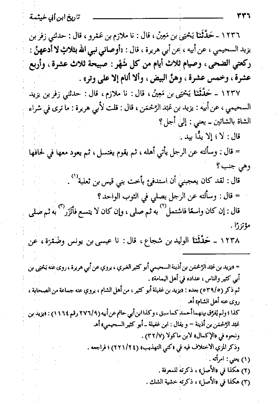 ١٢٣٦- حَدَّثَنا يَحْيَى بْن مَعِيْن، قَالَ: حدثنا مُلازِمُ بْنُ عَمْرو، قَالَ: حَدَّثَنِي زُفَرُ بْنُ يَزِيدَ السَّحِيمِيُّ، عَنْ أَبِيهِ، عَنْ أَبِي هُرَيْرَةَ، قَالَ: أَوْصَانِي نَبِيُّ اللَّهِ بثلاثٍ لا أدعهنَّ: ركعتي الضحى، وصيام ثلاث أَيَّامٍ مِنْ كُلِّ شَهْر: صَبِيحَةَ ثَلاثَ عَشْرَةَ، وَأَرْبَعَ عَشْرَةَ، وَخَمْسَ عَشْرَةَ، وهنَّ الْبِيضُ، وَأَلا أَنَامُ إِلا عَلَى وِتْرٍ.