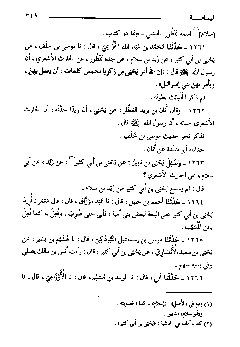١٢٦٣ - وَسُئِلَ يَحْيَى بْنُ مَعِيْن: عَنْ يَحْيَى بْنِ أَبِي كَثِيرٍ، عَنْ زَيْد، عَنْ أبي سلام، عَنِ الحارث الأشعري؟ قَالَ: لم يسمع يَحْيَى بْن أبي كثير من زَيْد بْن سلام.
