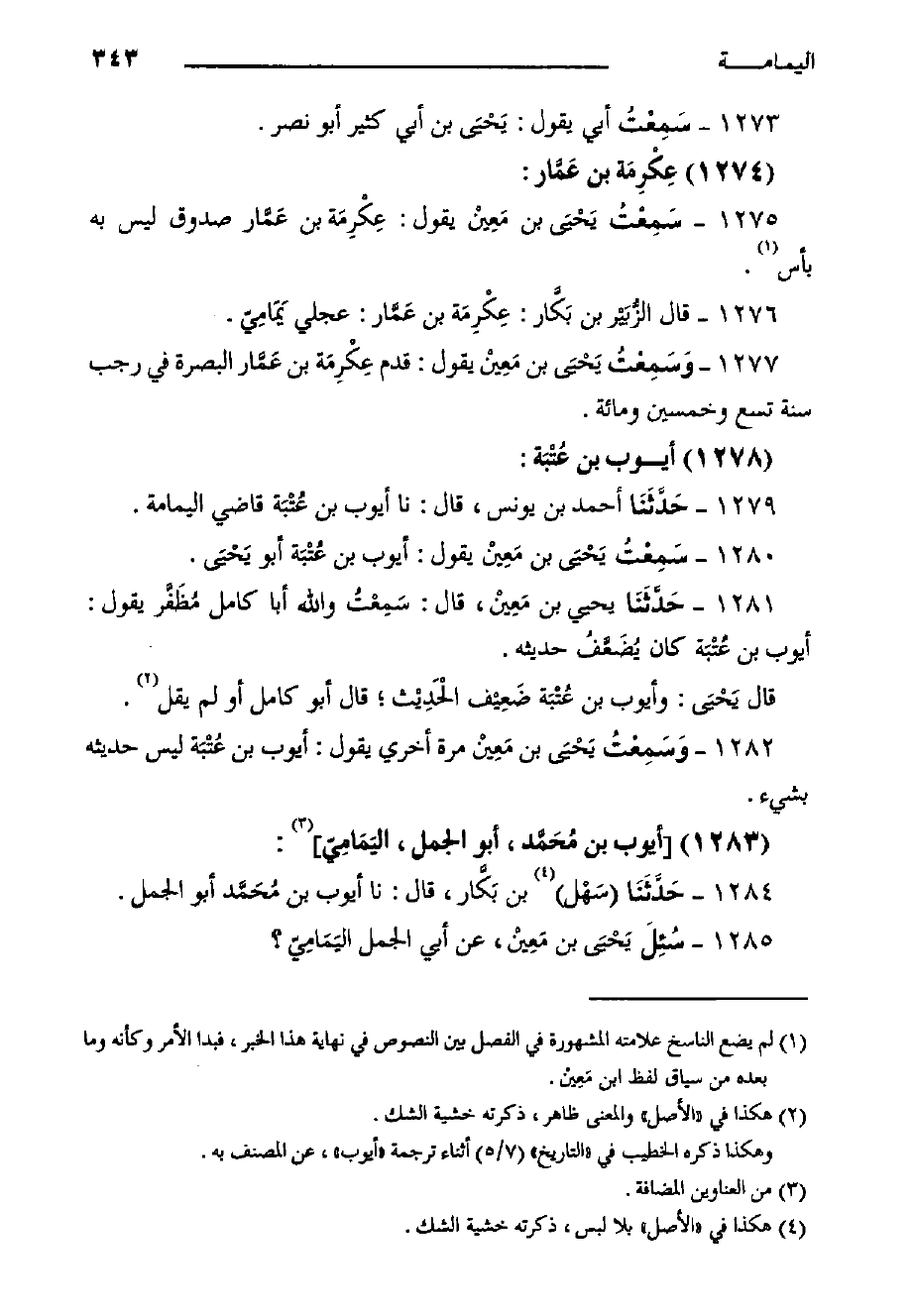 ١٢٧٥- سَمِعْتُ يَحْيَى بْن مَعِيْن يَقُولُ: عِكْرِمَة بْن عَمَّار صدوق ليس به بأس.