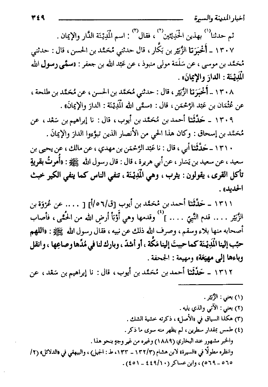 ١٣٠٨- أَخْبَرَنَا الزُّبَيْر، قَالَ: حَدَّثَنِي مُحَمَّد بْنُ الْحَسَنِ، عَنْ مُحَمَّد بْن طَلْحَةَ، عَنْ عُثْمَان بْن عَبْد الرَّحْمَن، قَالَ: سمَّى اللَّه الْمَدِيْنَة: الدارَ والإيمانَ.