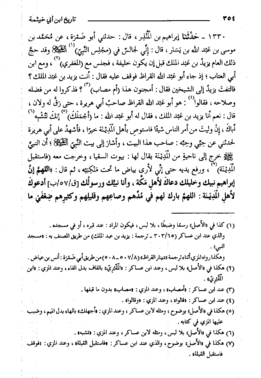 ١٣٣٠- حَدَّثَنا إِبْرَاهِيمُ بْنُ الْمُنْذِر، قَالَ: حَدَّثَنِي أَبُو ضَمْرَة، عَنْ مُحَمَّد بْنِ مُوسَى بْنِ عَبْد اللَّهِ بْنِ يَسَار، قَالَ: إِنِّي لجالسٌ في مجْلِس النَّبِيّ عليه السلام وَقَدْ حجَّ ذَلِكَ الْعَامُ يزيدُ بْنُ عَبْد الْمَلِكِ قَبْلَ أَنْ يَكُونَ خَلِيفَةً، فَجَلَسَ مَعَ الْمِغْفَرِيِّ، وَمَعَ ابْنِ أَبِي الْعَتَّابِ؛ إِذْ جَاءَ أَبُو عَبْد اللَّهِ الْقَرَّاظُ فَوَقَفَ عَلَيْهِ فَقَالَ: أَنْتَ يَزِيدُ بْنُ عَبْد الْمَلِكِ؟ فالتفتَ يزيدُ إِلَى الشَّيْخَيْنِ فَقَالَ: أَمَجْنُونٌ هَذَا (أَمْ مُصَابٌ؟ فَذَكَرُوا لَهُ مِنْ فَضْلِهِ وَصَلاحِهِ، فَقَالُوا: هُوَ أَبُو عَبْد اللَّهِ الْقَرَّاظُ صاحبُ أَبِي هُرَيْرَةَ، حَتَّى رَقَّ لَهُ وَلانَ، قَالَ: نَعَمْ أَنَا يَزِيدُ بْنُ عَبْد الْمَلِكِ، فَقَالَ لَهُ أَبُو عَبْد الله: مَا (أجْمَلَكَ إنكَ لتُشْبِه أباكَ، إِنْ وليتَ مِنْ أَمْرِ النَّاسِ شَيْئًا فاستوصِ بِأَهْلِ الْمَدِيْنَة خَيْرًا، فأشهدُ عَلَى أَبِي هُرَيْرَةَ لَحَدَّثَنِي عَنْ حِبِّي وحِبِّه: صَاحِبَ هَذَا البيت، وأشارَ إلى بيت النَّبِيّ عَلَيْهِ السَّلامُ؛ أَنَّ النبيَّ صَلَّى اللَّهُ عَلَيْهِ وَسَلَّمَ خَرَجَ إِلَى ناحيةٍ مِنَ الْمَدِيْنَة يُقَالُ لَهَا: بُيُوتُ السُّقْيَا، وَخَرَجْتُ مَعَهُ فَاسْتَقْبَلَ الْمَدِيْنَة، وَرَفَعَ يَدَيْهِ حَتَّى إنِّي لأرى بياض مَا تَحْتَ مَنْكِبَيْه، ثُمَّ قَالَ: اللهمَّ إنَّ إِبْرَاهِيمَ نَبِيَّكَ وَخَلِيلَكَ دعاكَ لأهلِ مَكَّة، وَأَنَا نبيُّك ورسولُك [ق/٥٧/ب] أدعوكَ لأهلِ الْمَدِيْنَة: اللهمَّ بَارِكْ لَهُمْ فِي مُدِّهم وصاعِهم وقليلِهم وكثيرِهم ضِعْفَيْ م