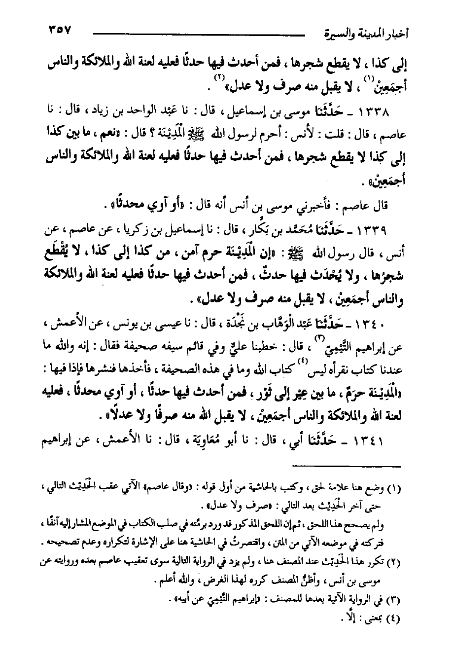 ١٣٣٨- حَدَّثَنا مُوسَى بْنُ إِسْمَاعِيلَ، قال: حَدَّثَنَا عَبْد الْوَاحِدِ بْنُ زِيَادٍ، قال: حدثنا عَاصِمٌ، قَالَ: قُلْتُ: لأَنَسٍ: أَحَرَّمَ لِرَسُولِ اللَّهِ صَلَّى اللَّهُ عَلَيْهِ وَسَلَّمَ الْمَدِيْنَة؟ قَالَ: نَعَمْ، مَا بَيْنَ كَذَا إِلَى كَذَا لا يُقْطَعُ شَجَرَهَا، فَمَنْ أَحْدَثَ فِيهَا حَدَثًا فَعَلَيْهِ لَعْنَةُ اللَّه وَالْمَلائِكَةِ وَالنَّاسِ أجمَعِيْن.
