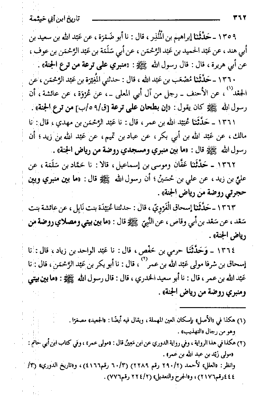 ١٣٦٢- حَدَّثَنا عَفَّان وَمُوسَى بن إسماعيل، قالا: حدثنا حَمَّاد بْنُ سَلَمَة، عَنْ عليِّ بْنِ زَيْدٍ، عَنْ عَلِيِّ بْنِ حُسَيْن؛ أَنّ رَسُولَ اللَّهِ صَلَّى اللَّهُ عَلَيْهِ وَسَلَّمَ قَالَ: مَا بَيْنَ مِنْبَرِي وَبَيْنَ حُجْرَتِي رَوْضَةٌ مِنْ رِيَاضِ الْجَنَّةِ.