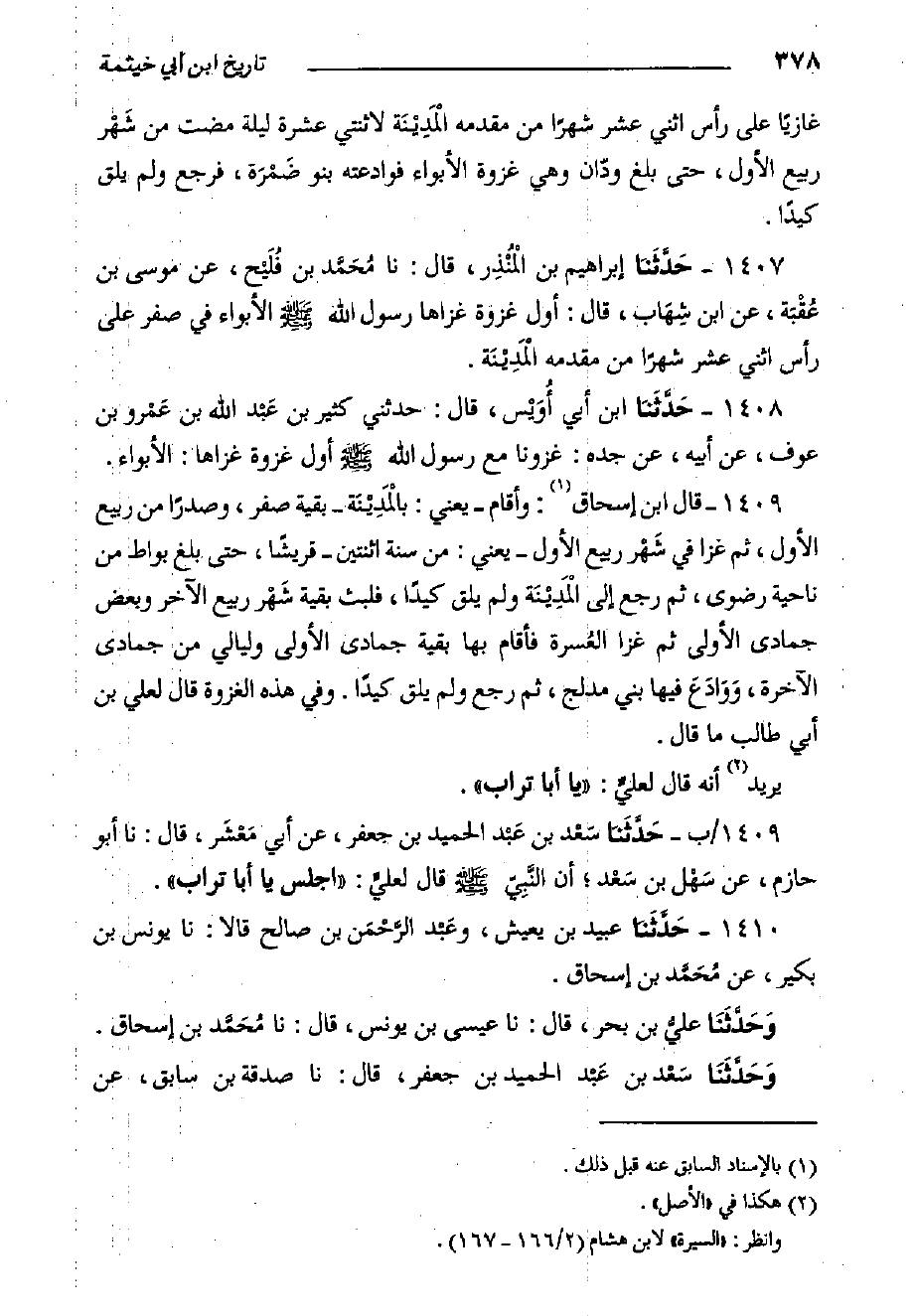 ١٤٠٧- حَدَّثَنا إِبْرَاهِيمُ بْنُ الْمُنْذِر، قَالَ: حدثنا مُحَمَّد بْن فُلَيْح، عَنْ مُوسَى بْن عُقْبَة، عَنِ ابن شِهَاب، قَالَ: أول غزوة غزاها رَسُول اللَّهِ صَلَّى اللَّهُ عَلَيْهِ وَسَلَّمَ الأبواء فِي صفر عَلَى رأس اثني عشر شهرًا من مقدمه الْمَدِيْنَة.