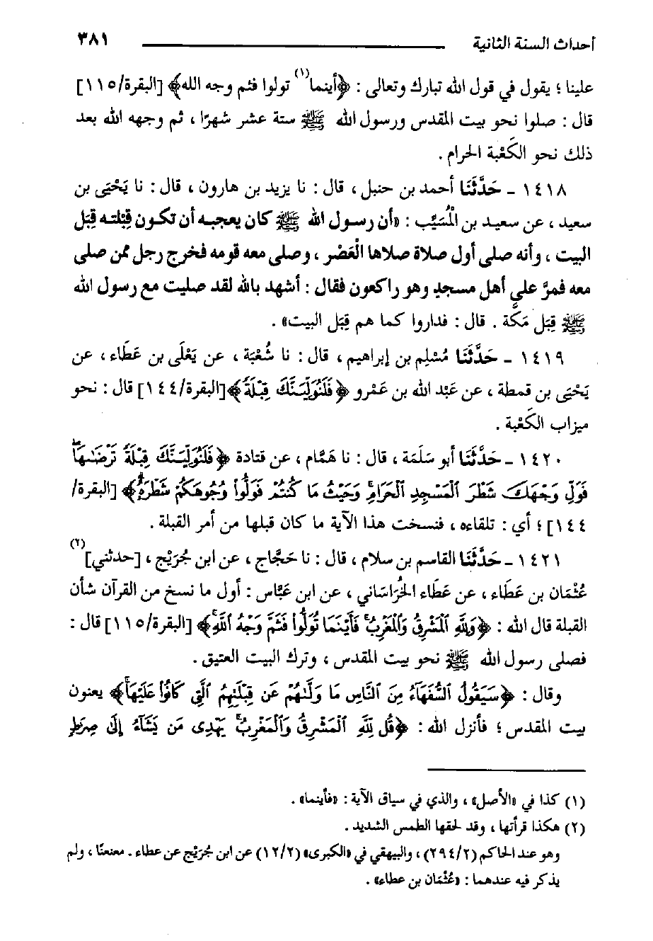 ١٤٢١- حَدَّثَنَا القاسم بن سلام، قال: حدثنا حَجَّاج، عَنِ ابْنِ جُرَيْج، حَدَّثَنِي عُثْمَان بْنُ عَطَاء، عَنْ عَطَاء الخُرَاسَاني، عَنِ ابْنِ عَبَّاس: أَوَّلُ مَا نُسِخَ مِنَ الْقُرْآنِ شَأْنُ الِقْبَلَةِ قَالَ اللَّهُ: {وَلِلَّهِ الْمَشْرِقُ وَالْمَغْرِبُ فَأَيْنَمَا تُوَلُّوا فَثَمَّ وَجْهُ الله} البقرة/١١٥ قَالَ: فَصَلَّى رَسُولُ اللَّهِ صَلَّى اللَّهُ عَلَيْهِ وَسَلَّمَ نَحْوَ بَيْتِ الْمَقْدِسِ، وَتَرَكَ الْبَيْتَ الْعَتِيقَ.