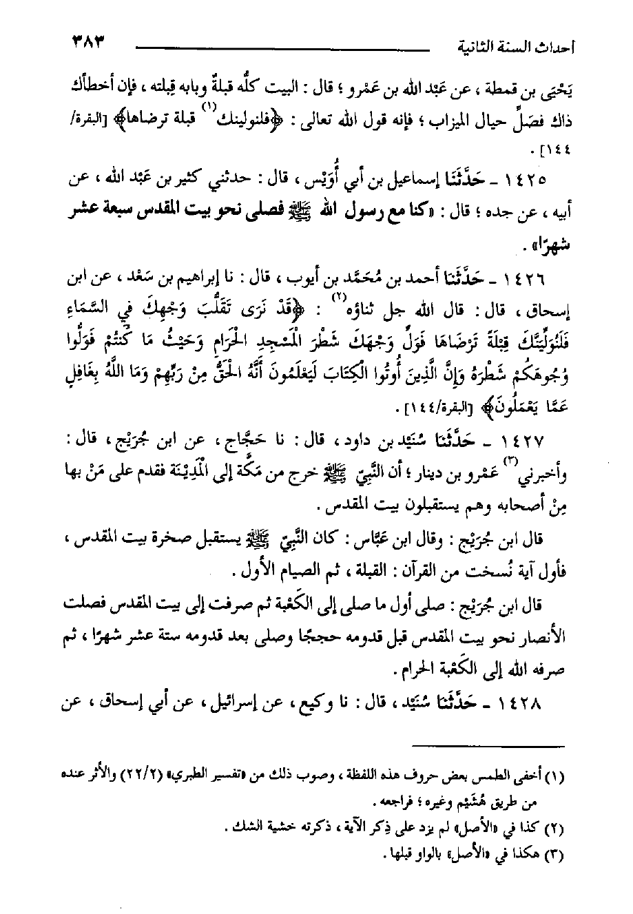 ١٤٢٦- حَدَّثَنا أَحْمَد بْن مُحَمَّد بْن أَيُّوبَ، قال: حدثنا إِبْرَاهِيم بْن سَعْد، عَنِ ابْن إِسْحَاقَ، قَالَ: قَالَ اللَّهُ جَلَّ ثناؤه: {قَدْ نَرَى تَقَلُّبَ وَجْهِكَ فِي السَّمَاءِ فَلَنُوَلِّيَنَّكَ قِبْلَةً تَرْضَاهَا فَوَلِّ وَجْهَكَ شَطْرَ الْمَسْجِدِ الْحَرَامِ وَحَيْثُ مَا كُنتُمْ فَوَلُّوا وُجُوهَكُمْ شَطْرَهُ وَإِنَّ الَّذِينَ أُوتُوا الْكِتَابَ لَيَعْلَمُونَ أَنَّهُ الْحَقُّ مِنْ رَبِّهِمْ وَمَا اللَّهُ بِغَافِلٍ عَمَّا يَعْمَلُونَ} البقرة/١٤٤.