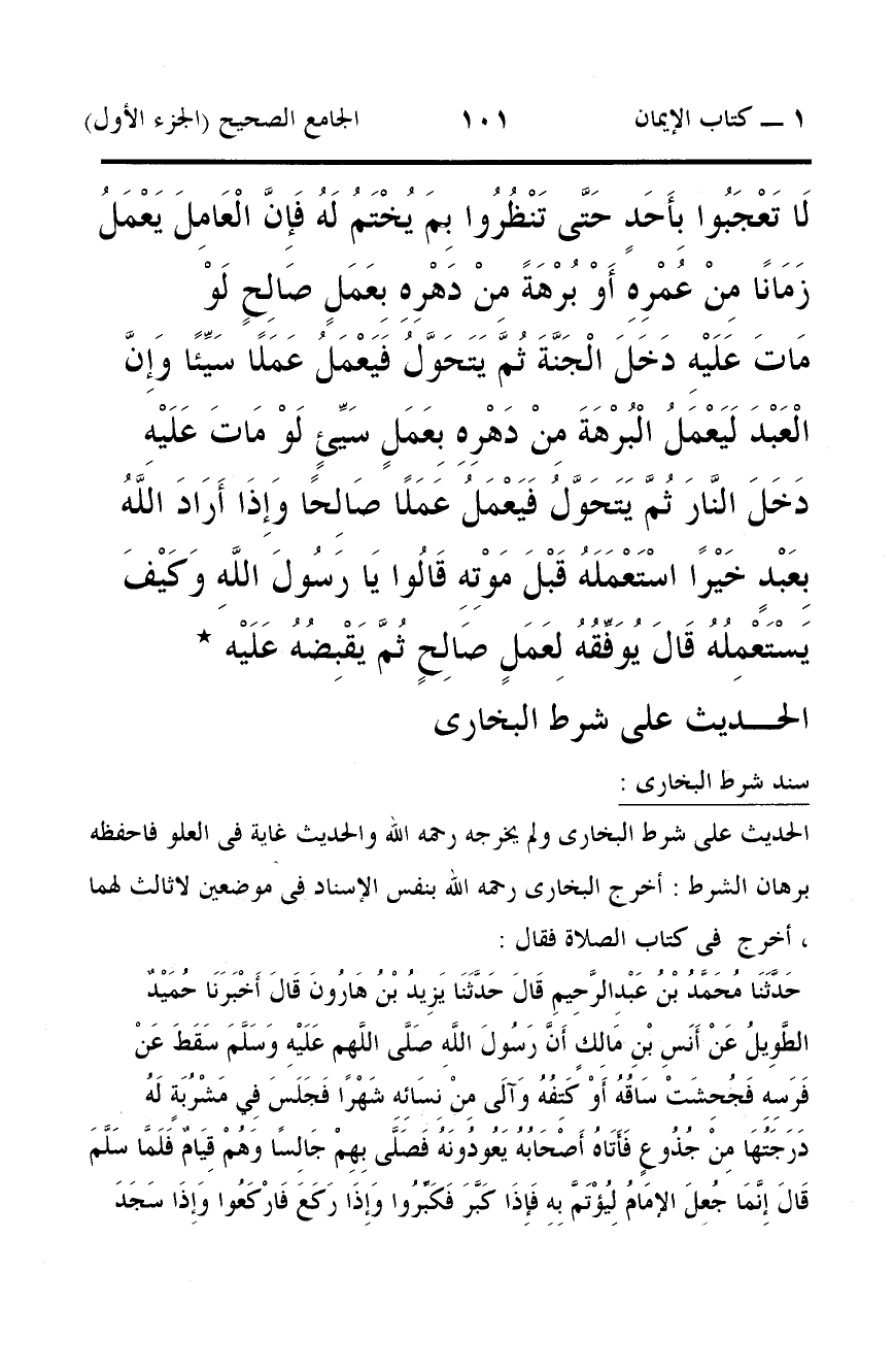 لَا تَعْجَبُوا بِأَحَدٍ حَتَّى تَنْظُرُوا بِمَ يُخْتَمُ لَهُ فَإِنَّ الْعَامِلَ يَعْمَلُ زَمَانًا مِنْ عُمْرِهِ أَوْ بُرْهَةً مِنْ دَهْرِهِ بِعَمَلٍ صَالِحٍ لَوْ مَاتَ عَلَيْهِ دَخَلَ الْجَنَّةَ ثُمَّ يَتَحَوَّلُ فَيَعْمَلُ عَمَلًا سَيِّئًا وَإِنَّ الْعَبْدَ لَيَعْمَلُ الْبُرْهَةَ مِنْ دَهْرِهِ بِعَمَلٍ سَيِّئٍ لَوْ مَاتَ عَلَيْهِ دَخَلَ النَّارَ ثُمَّ يَتَحَوَّلُ فَيَعْمَلُ عَمَلًا صَالِحًا وَإِذَا أَرَادَ اللَّهُ بِعَبْدٍ خَيْرًا اسْتَعْمَلَهُ قَبْلَ مَوْتِهِ قَالُوا يَا رَسُولَ اللَّهِ وَكَيْفَ يَسْتَعْمِلُهُ قَالَ يُوَفِّقُهُ لِعَمَلٍ صَالِحٍ ثُمَّ يَقْبِضُهُ عَلَيْه *