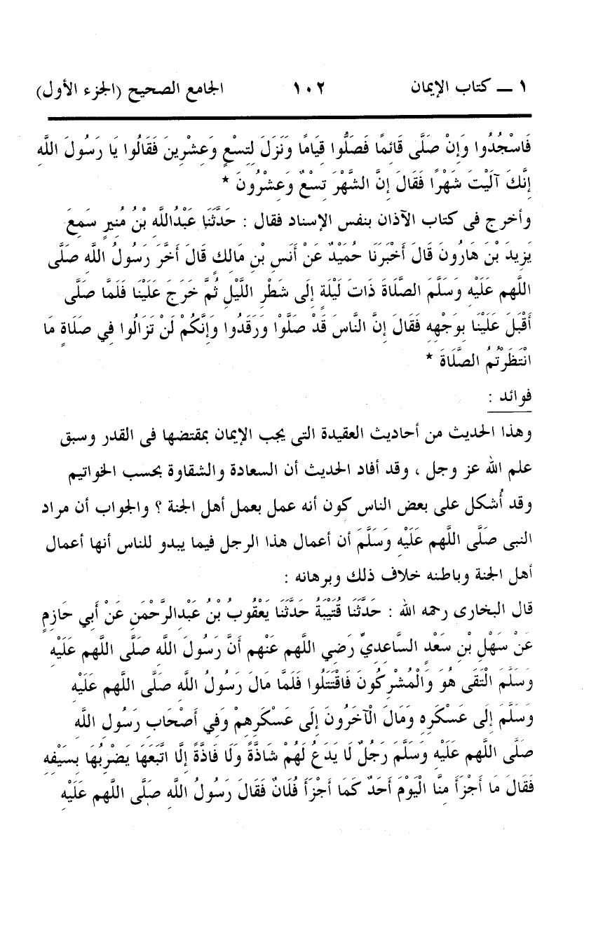 قال البخارى رحمه الله: حَدَّثَنَا قُتَيْبَةُ حَدَّثَنَا يَعْقُوبُ بْنُ عَبْدِالرَّحْمَنِ عَنْ أَبِي حَازِمٍ عَنْ سَهْلِ بْنِ سَعْدٍ السَّاعِدِيِّ رَضِي اللَّهم عَنْهم أَنَّ رَسُولَ اللَّهِ صَلَّى اللَّهم عَلَيْهِ وَسَلَّمَ الْتَقَى هُوَ وَالْمُشْرِكُونَ فَاقْتَتَلُوا فَلَمَّا مَالَ رَسُولُ اللَّهِ صَلَّى اللَّهم عَلَيْهِ وَسَلَّمَ إِلَى عَسْكَرِهِ وَمَالَ الْآخَرُونَ إِلَى عَسْكَرِهِمْ وَفِي أَصْحَابِ رَسُولِ اللَّهِ صَلَّى اللَّهم عَلَيْهِ وَسَلَّمَ رَجُلٌ لَا يَدَعُ لَهُمْ شَاذَّةً وَلَا فَاذَّةً إِلَّا اتَّبَعَهَا يَضْرِبُهَا بِسَيْفِهِ فَقَالَ مَا أَجْزَأَ مِنَّا الْيَوْمَ أَحَدٌ كَمَا أَجْزَأَ فُلَانٌ فَقَالَ رَسُولُ اللَّهِ صَلَّى اللَّهم عَلَيْهِ
