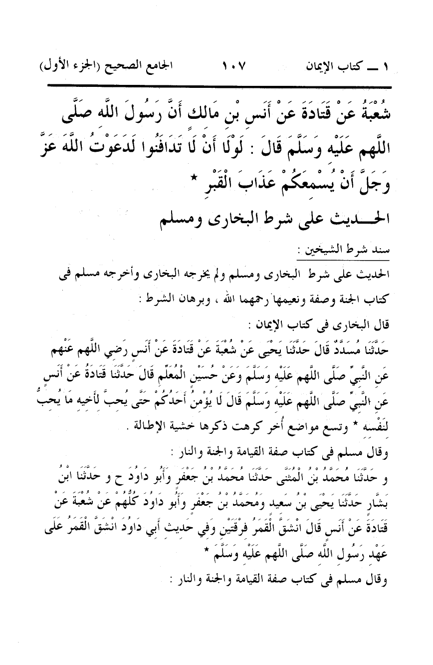 شُعْبَةُ عَنْ قَتَادَةَ عَنْ أَنَسِ بْنِ مَالِكٍ أَنَّ رَسُولَ اللَّهِ صَلَّى اللَّهم عَلَيْهِ وَسَلَّمَ قَالَ: لَوْلَا أَنْ لَا تَدَافَنُوا لَدَعَوْتُ اللَّهَ عَزَّ وَجَلَّ أَنْ يُسْمِعَكُمْ عَذَابَ الْقَبْرِ *
