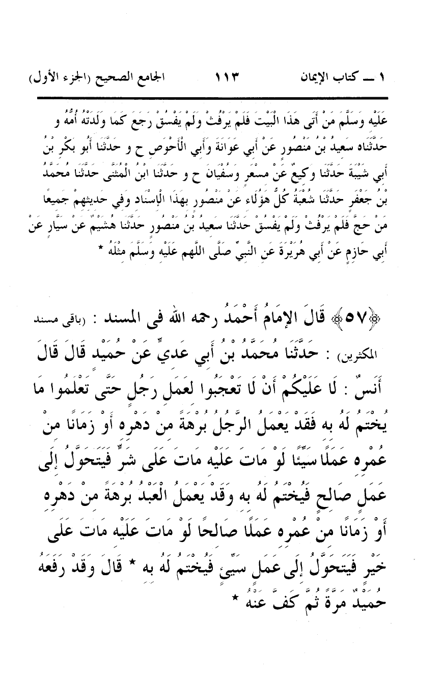 57 - قَالَ الإمَامُ أَحْمَدُ رحمه الله فى المسند: (باقى مسند المكثرين): حَدَّثَنَا مُحَمَّدُ بْنُ أَبِي عَدِيٍّ عَنْ حُمَيْدٍ قَالَ قَالَ أَنَسٌ: لَا عَلَيْكُمْ أَنْ لَا تَعْجَبُوا لِعَمَلِ رَجُلٍ حَتَّى تَعْلَمُوا مَا