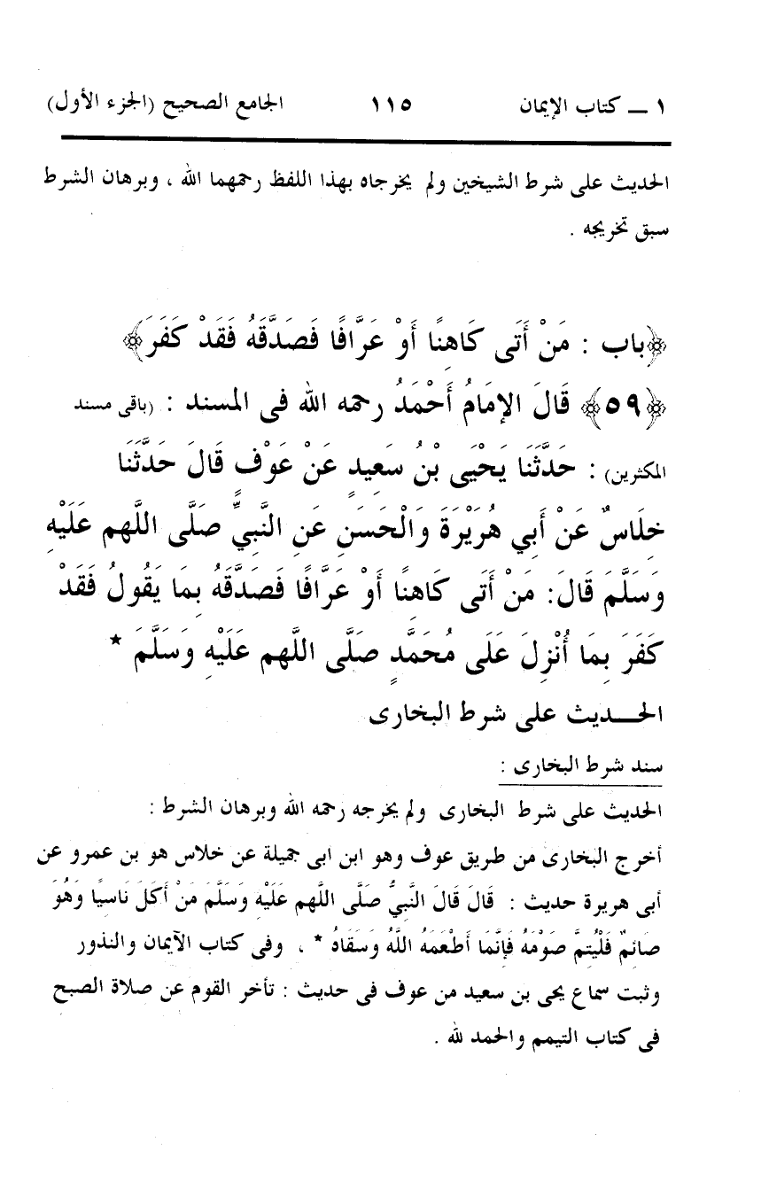 59 - قَالَ الإمَامُ أَحْمَدُ رحمه الله فى المسند: (باقى مسند المكثرين): حَدَّثَنَا يَحْيَى بْنُ سَعِيدٍ عَنْ عَوْفٍ قَالَ حَدَّثَنَا خِلَاسٌ عَنْ أَبِي هُرَيْرَةَ وَالْحَسَنِ عَنِ النَّبِيِّ صَلَّى اللَّهم عَلَيْهِ وَسَلَّمَ قَالَ: مَنْ أَتَى كَاهِنًا أَوْ عَرَّافًا فَصَدَّقَهُ بِمَا يَقُولُ فَقَدْ كَفَرَ بِمَا أُنْزِلَ عَلَى مُحَمَّدٍ صَلَّى اللَّهم عَلَيْهِ وَسَلَّمَ *