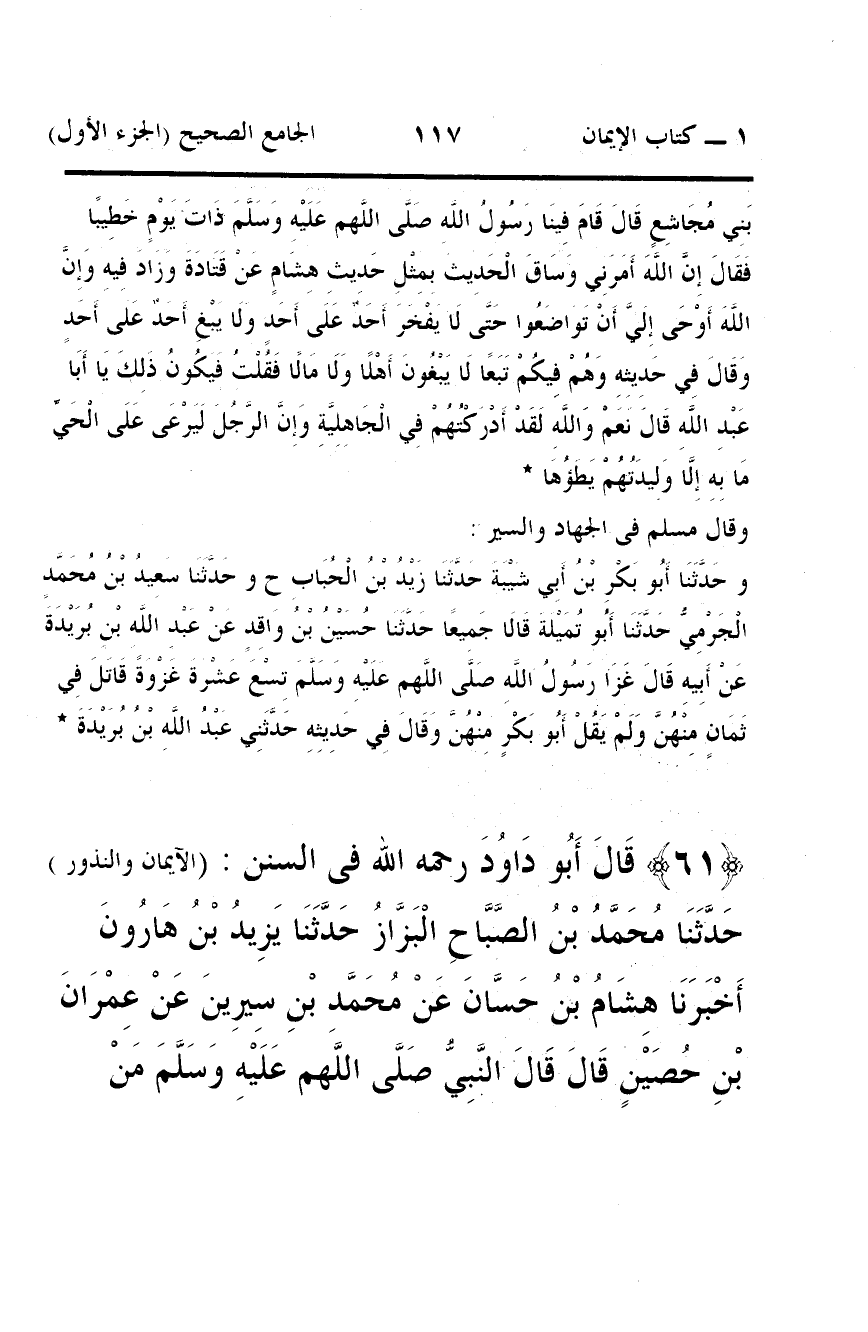 61 - قَالَ أَبُو دَاوُدَ رحمه الله فى السنن: (الآيمان والنذور) حَدَّثَنَا مُحَمَّدُ بْنُ الصَّبَّاحِ الْبَزَّازُ حَدَّثَنَا يَزِيدُ بْنُ هَارُونَ أَخْبَرَنَا هِشَامُ بْنُ حَسَّانَ عَنْ مُحَمَّدِ بْنِ سِيرِينَ عَنْ عِمْرَانَ بْنِ حُصَيْنٍ قَالَ قَالَ النَّبِيُّ صَلَّى اللَّهم عَلَيْهِ وَسَلَّمَ مَنْ