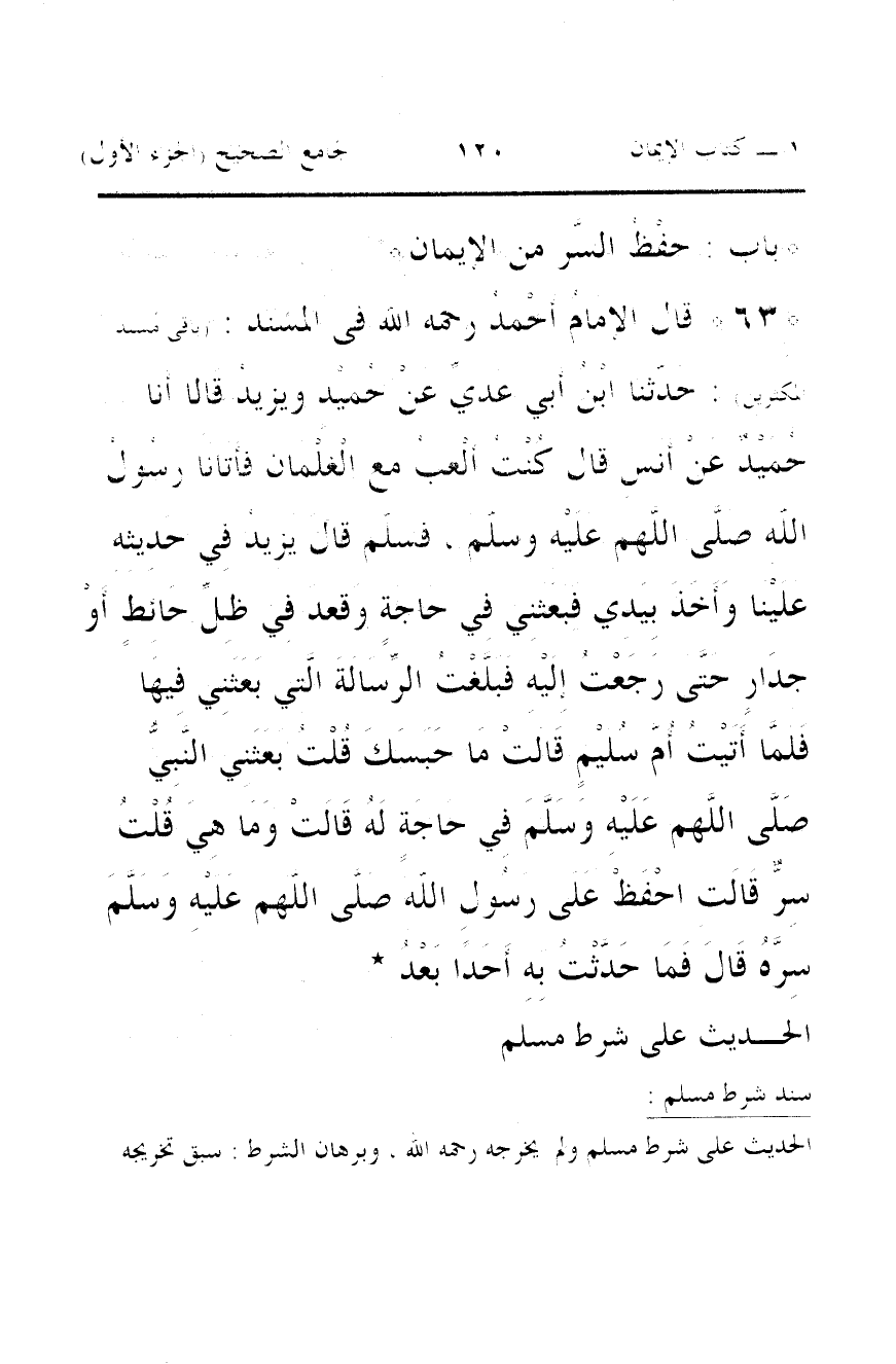 صَلَّى اللَّهم عَلَيْهِ وَسَلَّمَ فِي حَاجَةٍ لَهُ قَالَتْ وَمَا هِيَ قُلْتُ سِرٌّ قَالَتِ احْفَظْ عَلَى رَسُولِ اللَّهِ صَلَّى اللَّهم عَلَيْهِ وَسَلَّمَ سِرَّهُ قَالَ فَمَا حَدَّثْتُ بِهِ أَحَدًا بَعْدُ *