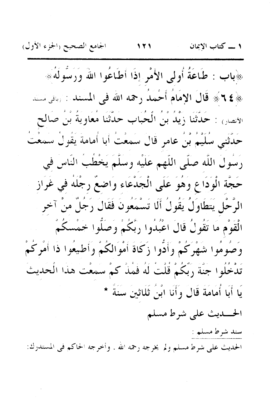 64 - قَالَ الإمَامُ أَحْمَدُ رحمه الله فى المسند: (باقى مسند الأنصار): حَدَّثَنَا زَيْدُ بْنُ الْحُبَابِ حَدَّثَنَا مُعَاوِيَةُ بْنُ صَالِحٍ حَدَّثَنِي سُلَيْمُ بْنُ عَامِرٍ قَالَ سَمِعْتُ أَبَا أُمَامَةَ يَقُولُ سَمِعْتُ رَسُولَ اللَّهِ صَلَّى اللَّهم عَلَيْهِ وَسَلَّمَ يَخْطُبُ النَّاسَ فِي حَجَّةِ الْوَدَاعِ وَهُوَ عَلَى الْجَدْعَاءِ وَاضِعٌ رِجْلَهُ فِي غَرَازِ الرَّحْلِ يَتَطَاوَلُ يَقُولُ أَلَا تَسْمَعُونَ فَقَالَ رَجُلٌ مِنْ آخِرِ الْقَوْمِ مَا تَقُولُ قَالَ اعْبُدُوا رَبَّكُمْ وَصَلُّوا خَمْسَكُمْ