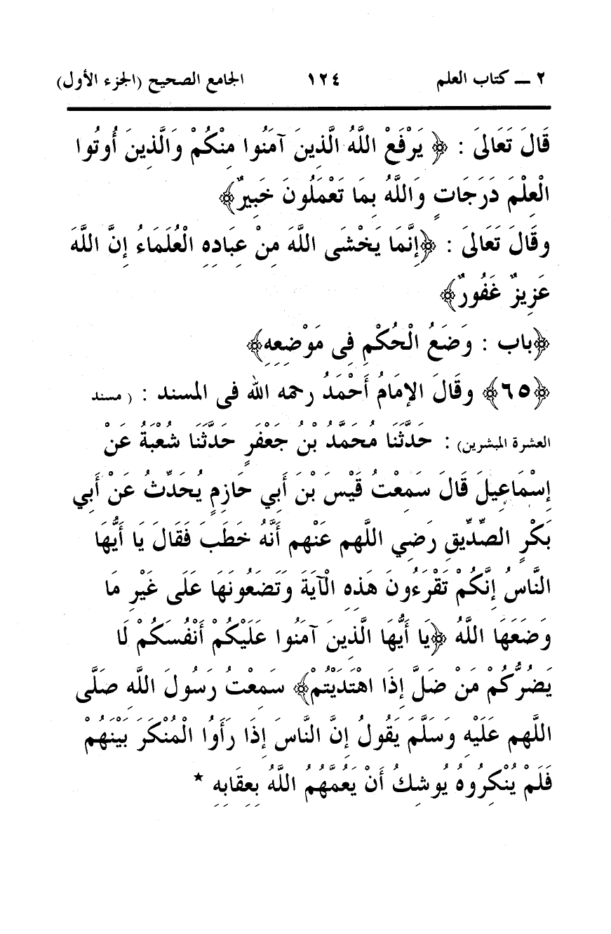 65 - وقَالَ الإمَامُ أَحْمَدُ رحمه الله فى المسند: (مسند العشرة المبشرين): حَدَّثَنَا مُحَمَّدُ بْنُ جَعْفَرٍ حَدَّثَنَا شُعْبَةُ عَنْ إِسْمَاعِيلَ قَالَ سَمِعْتُ قَيْسَ بْنَ أَبِي حَازِمٍ يُحَدِّثُ عَنْ أَبِي بَكْرٍ الصِّدِّيقِ رَضِي اللَّهم عَنْهم أَنَّهُ خَطَبَ فَقَالَ يَا أَيُّهَا النَّاسُ إِنَّكُمْ تَقْرَءُونَ هَذِهِ الْآيَةَ وَتَضَعُونَهَا عَلَى غَيْرِ مَا وَضَعَهَا اللَّهُ {يَا أَيُّهَا الَّذِينَ آمَنُوا عَلَيْكُمْ أَنْفُسَكُمْ لَا يَضُرُّكُمْ مَنْ ضَلَّ إِذَا اهْتَدَيْتُمْ} سَمِعْتُ رَسُولَ اللَّهِ صَلَّى