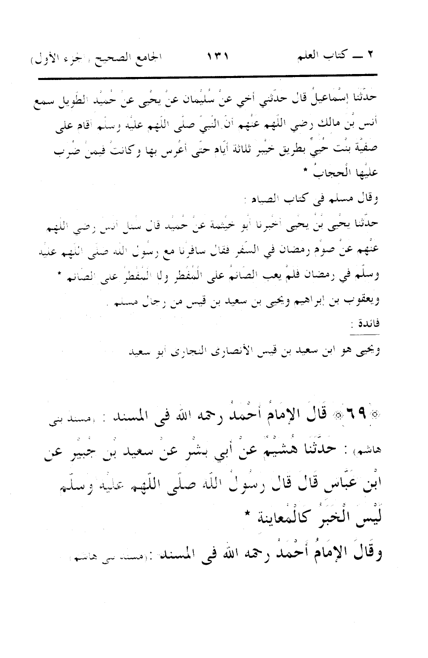 69 - قَالَ الإمَامُ أَحْمَدُ رحمه الله فى المسند: (مسند بنى هاشم): حَدَّثَنَا هُشَيْمٌ عَنْ أَبِي بِشْرٍ عَنْ سَعِيدِ بْنِ جُبَيْرٍ عَنِ ابْنِ عَبَّاسٍ قَالَ قَالَ رَسُولُ اللَّهِ صَلَّى اللَّهم عَلَيْهِ وَسَلَّمَ لَيْسَ الْخَبَرُ كَالْمُعَايَنَةِ *