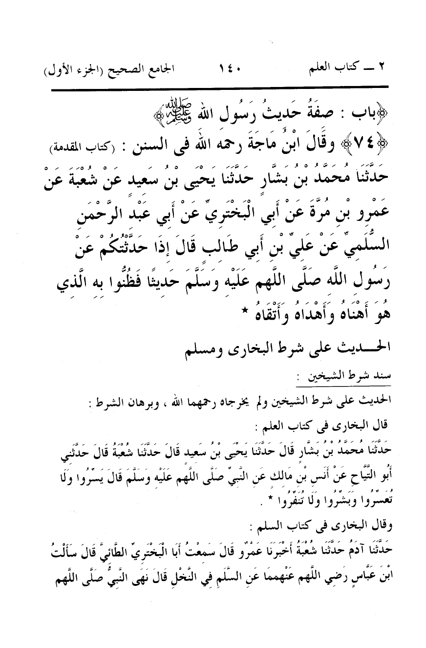 74 - وقَالَ ابْنُ مَاجَةَ رحمه الله فى السنن: (كتاب المقدمة) حَدَّثَنَا مُحَمَّدُ بْنُ بَشَّارٍ حَدَّثَنَا يَحْيَى بْنُ سَعِيدٍ عَنْ شُعْبَةَ عَنْ عَمْرِو بْنِ مُرَّةَ عَنْ أَبِي الْبَخْتَرِيِّ عَنْ أَبِي عَبْدِ الرَّحْمَنِ السُّلَمِيِّ عَنْ عَلِيِّ بْنِ أَبِي طَالِبٍ قَالَ إِذَا حَدَّثْتُكُمْ عَنْ رَسُولِ اللَّهِ صَلَّى اللَّهم عَلَيْهِ وَسَلَّمَ حَدِيثًا فَظُنُّوا بِهِ الَّذِي هُوَ أَهْنَاهُ وَأَهْدَاهُ وَأَتْقَاهُ *