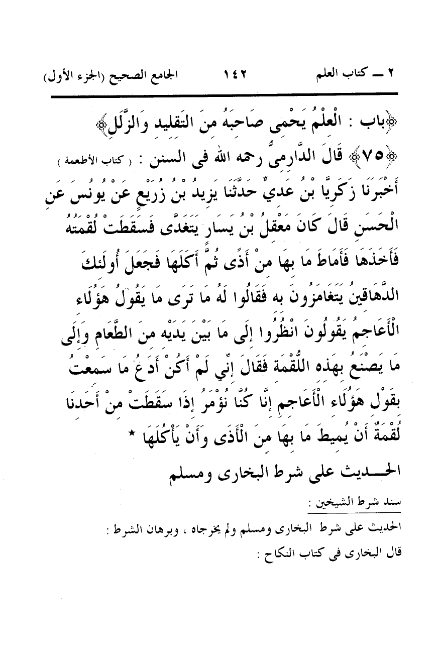 75 - قَالَ الدَّارِمِىُّ رحمه الله فى السنن: (كتاب الأطعمة) أَخْبَرَنَا زَكَرِيَّا بْنُ عَدِيٍّ حَدَّثَنَا يَزِيدُ بْنُ زُرَيْعٍ عَنْ يُونُسَ عَنِ الْحَسَنِ قَالَ كَانَ مَعْقِلُ بْنُ يَسَارٍ يَتَغَدَّى فَسَقَطَتْ لُقْمَتُهُ فَأَخَذَهَا فَأَمَاطَ مَا بِهَا مِنْ أَذًى ثُمَّ أَكَلَهَا فَجَعَلَ أُولَئِكَ الدَّهَاقِينُ يَتَغَامَزُونَ بِهِ فَقَالُوا لَهُ مَا تَرَى مَا يَقُولُ هَؤُلَاءِ الْأَعَاجِمُ يَقُولُونَ انْظُرُوا إِلَى مَا بَيْنَ يَدَيْهِ مِنَ الطَّعَامِ وَإِلَى مَا يَصْنَعُ بِهَذِهِ اللُّقْمَةِ فَقَالَ إِنِّي لَمْ أَكُنْ أَدَعُ مَا سَمِعْتُ بِقَوْلِ هَؤُلَاءِ الْأَعَاجِمِ إِنَّا كُنَّا نُؤْمَرُ إِذَا سَقَطَتْ مِنْ أَحَدِنَا لُقْمَةٌ أَنْ يُمِيطَ مَا بِهَا مِنَ الْأَذَى وَأَنْ يَاكُلَهَا *