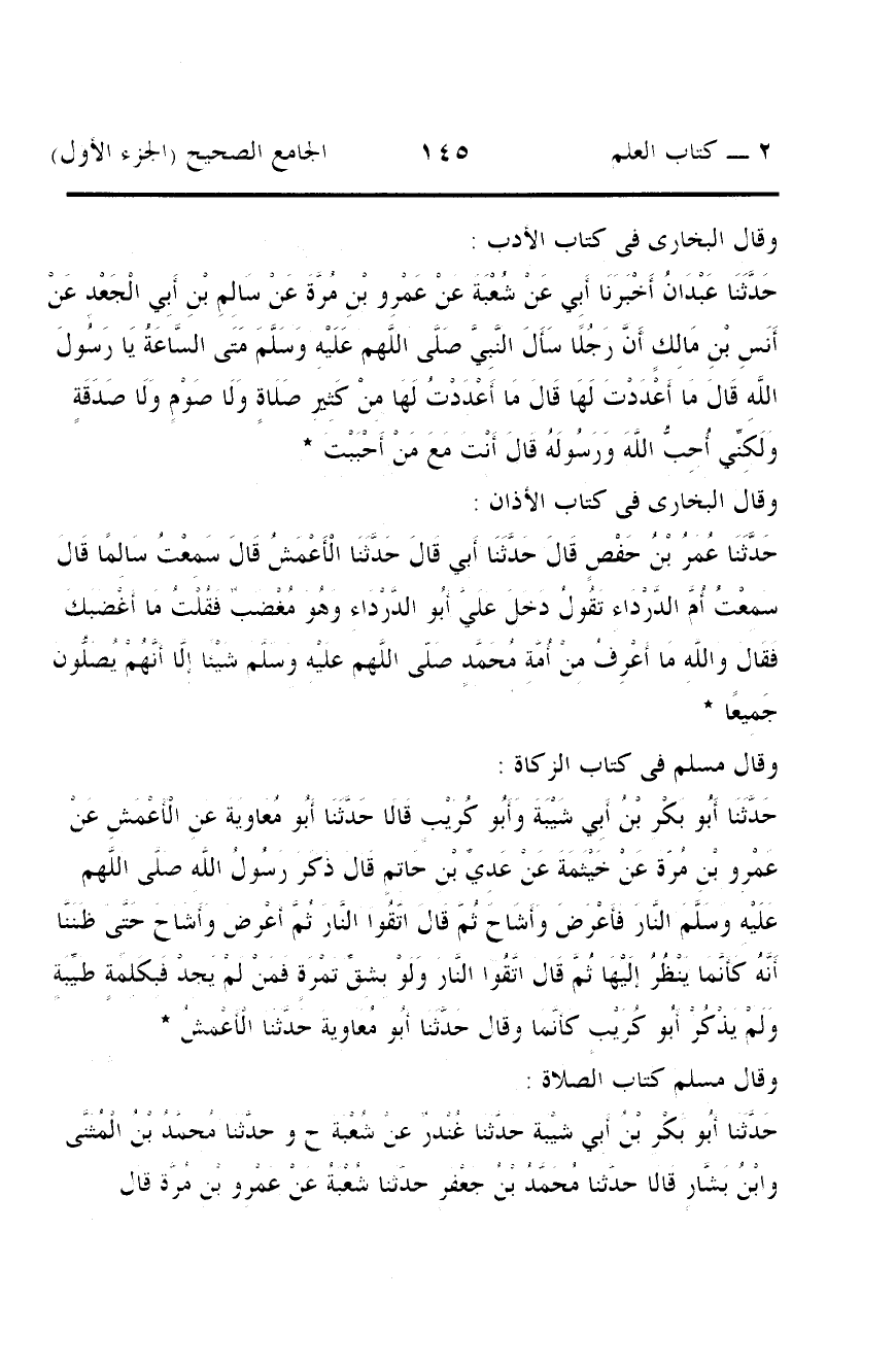 حَدَّثَنَا عَبْدَانُ أَخْبَرَنَا أَبِي عَنْ شُعْبَةَ عَنْ عَمْرِو بْنِ مُرَّةَ عَنْ سَالِمِ بْنِ أَبِي الْجَعْدِ عَنْ أَنَسِ بْنِ مَالِكٍ أَنَّ رَجُلًا سَأَلَ النَّبِيَّ صَلَّى اللَّهم عَلَيْهِ وَسَلَّمَ مَتَى السَّاعَةُ يَا رَسُولَ اللَّهِ قَالَ مَا أَعْدَدْتَ لَهَا قَالَ مَا أَعْدَدْتُ لَهَا مِنْ كَثِيرِ صَلَاةٍ وَلَا صَوْمٍ وَلَا صَدَقَةٍ وَلَكِنِّي أُحِبُّ اللَّهَ وَرَسُولَهُ قَالَ أَنْتَ مَعَ مَنْ أَحْبَبْتَ *