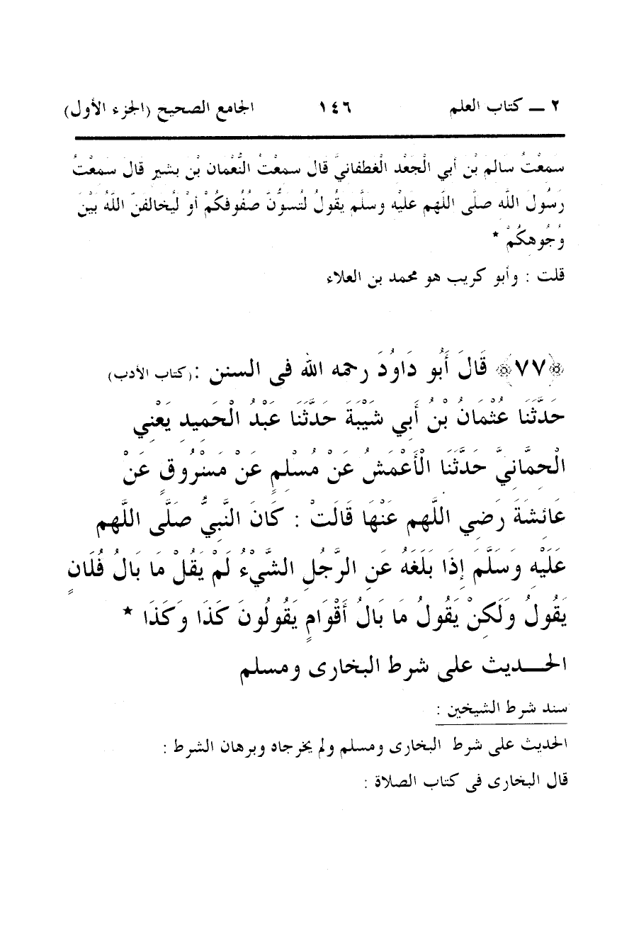 77 - قَالَ أَبُو دَاوُدَ رحمه الله فى السنن: (كتاب الأدب) حَدَّثَنَا عُثْمَانُ بْنُ أَبِي شَيْبَةَ حَدَّثَنَا عَبْدُ الْحَمِيدِ يَعْنِي الْحِمَّانِيَّ حَدَّثَنَا الْأَعْمَشُ عَنْ مُسْلِمٍ عَنْ مَسْرُوقٍ عَنْ عَائِشَةَ رَضِي اللَّهم عَنْهَا قَالَتْ: كَانَ النَّبِيُّ صَلَّى اللَّهم عَلَيْهِ وَسَلَّمَ إِذَا بَلَغَهُ عَنِ الرَّجُلِ الشَّيْءُ لَمْ يَقُلْ مَا بَالُ فُلَانٍ يَقُولُ وَلَكِنْ يَقُولُ مَا بَالُ أَقْوَامٍ يَقُولُونَ كَذَا وَكَذَا *
