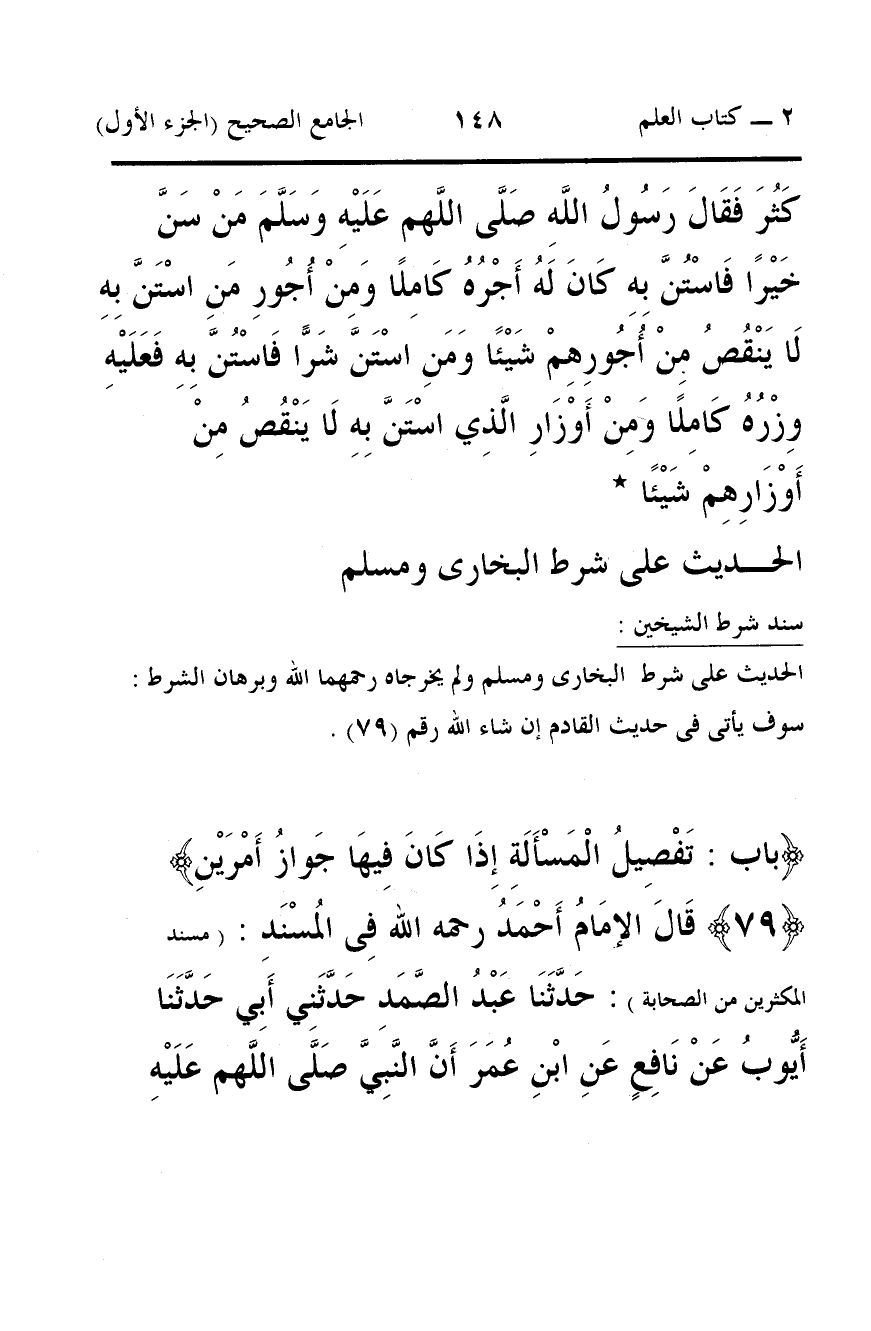 79 - قَالَ الإمَامُ أَحْمَدُ رحمه الله فِى المُسْنَدِ: (مسند المكثرين من الصحابة): حَدَّثَنَا عَبْدُ الصَّمَدِ حَدَّثَنِي أَبِي حَدَّثَنَا أَيُّوبُ عَنْ نَافِعٍ عَنِ ابْنِ عُمَرَ أَنَّ النَّبِيَّ صَلَّى اللَّهم عَلَيْهِ