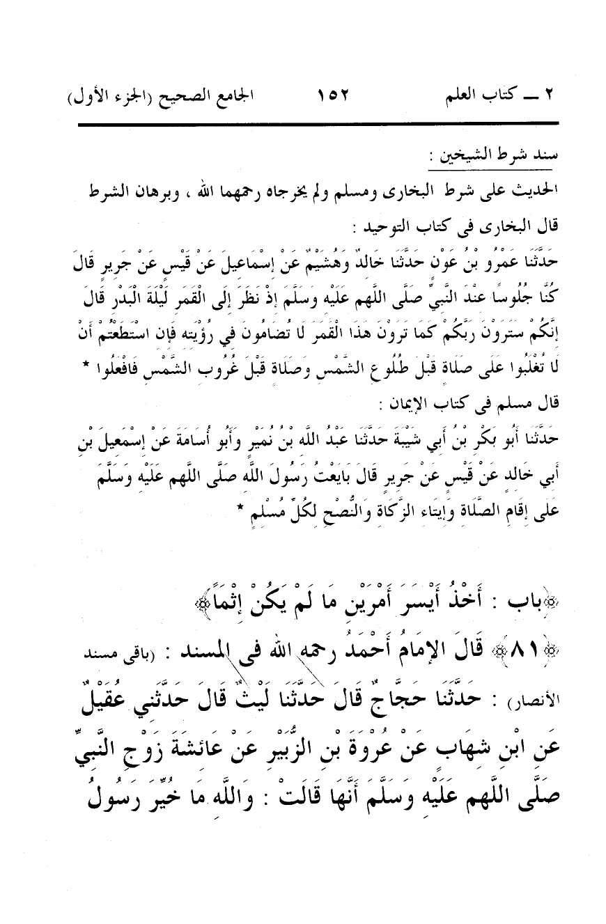 حَدَّثَنَا عَمْرُو بْنُ عَوْنٍ حَدَّثَنَا خَالِدٌ وَهُشَيْمٌ عَنْ إِسْمَاعِيلَ عَنْ قَيْسٍ عَنْ جَرِيرٍ قَالَ كُنَّا جُلُوسًا عِنْدَ النَّبِيِّ صَلَّى اللَّهم عَلَيْهِ وَسَلَّمَ إِذْ نَظَرَ إِلَى الْقَمَرِ لَيْلَةَ الْبَدْرِ قَالَ إِنَّكُمْ سَتَرَوْنَ رَبَّكُمْ كَمَا تَرَوْنَ هَذَا الْقَمَرَ لَا تُضَامُونَ فِي رُؤْيَتِهِ فَإِنِ اسْتَطَعْتُمْ أَنْ لَا تُغْلَبُوا عَلَى صَلَاةٍ قَبْلَ طُلُوعِ الشَّمْسِ وَصَلَاةٍ قَبْلَ غُرُوبِ الشَّمْسِ فَافْعَلُوا *