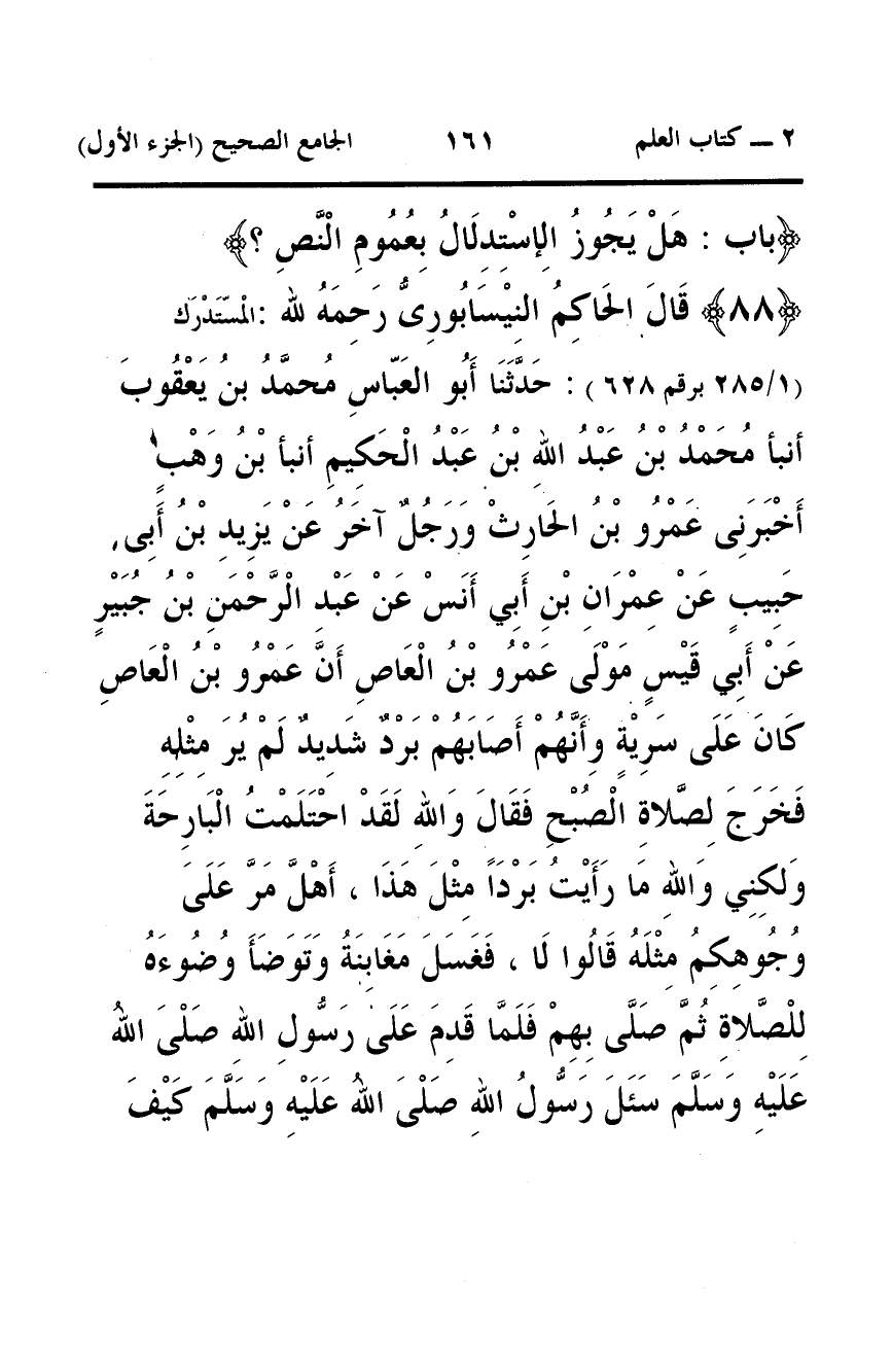 88 - قَالَ الحَاكِمُ النِيْسَابُورِىُّ رَحِمَهُ لله: المْسّتَدْرَك (1/ 285 برقم 628): حَدَّثَنَا أَبُو العَبّاسِ مُحمَّدُ بنُ يَعْقُوبَ أنبأ مُحَمْدُ بْنُ عَبْدُ اللهِ بْنُ عَبْدُ الْحَكِيمِ أنبأ بْنُ وَهْبٍ أَخْبَرَنِى عَمْرُو بْنُ الحَارِثْ وَرَجُلٌ آخَرُ عَنْ يَزِيدِ بْنُ أَبِى حَبِيبٍ عَنْ عِمْرَانِ بْنِ أَبِي أَنَسْ عَنْ عَبْدِ الْرَّحْمَنِ بْنُ جُبَيْرٍ عَنْ أَبِي قَيْسٍ مَوْلَى عَمْرُو بْنُ الْعَاصِ أَنَّ عَمْرُو بْنُ الْعَاصِ كَانَ عَلَى سَرِيْةٍ وِأَنَّهُمْ أَصَابَهُمْ بَرْدٌ شَدِيدٌ لَمْ يُرَ مِثْلِهِ فَخَرَجَ لِصَّلاةِ الْصُبْحِ فَقَالَ وَاللهِ لَقَدْ احْتَلَمْتُ الْبَارِحَةَ وَلكِنِي وَاللهِ مَا رَأَيْتُ بَرْدَاً مِثْلَ هَذَا، أَهْلَّ مَرَّ عَلَىَ وُجُوهِكِمُ مِثْلَهُ قَالُوا لَا، فَغَسَلَ مَغَابِنَةُ وَتَوَضَأَ وُضُوءَهُ لِلْصَّلاةِ ثُمَّ صَلَّى بِهِمْ فَلَمَّا قَدِمَ عَلَى رَسُّولِ اللهِ صَلْىَ اللهُ عَلَيْهِ وَسَلَّمَ سَئَلَ رَسُّولُ اللهِ صَلْىَ اللهُ عَلَيْهِ وَسَلَّمَ كَيْفَ