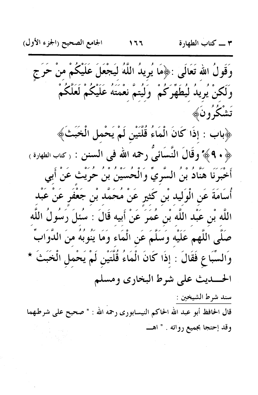 90 - وقَالَ النَّسَائىُّ رحمه الله فى السنن: (كتاب الطهارة) أَخْبَرَنَا هَنَّادُ بْنُ السَّرِيِّ وَالْحُسَيْنُ بْنُ حُرَيْثٍ عَنْ أَبِي أُسَامَةَ عَنِ الْوَلِيدِ بْنِ كَثِيرٍ عَنْ مُحَمَّدِ بْنِ جَعْفَرٍ عَنْ عَبْدِ اللَّهِ بْنِ عَبْدِ اللَّهِ بْنِ عُمَرَ عَنْ أَبِيهِ قَالَ: سُئِلَ رَسُولُ اللَّهِ صَلَّى اللَّهم عَلَيْهِ وَسَلَّمَ عَنِ الْمَاءِ وَمَا يَنُوبُهُ مِنَ الدَّوَابِّ وَالسِّبَاعِ فَقَالَ: إِذَا كَانَ الْمَاءُ قُلَّتَيْنِ لَمْ يَحْمِلِ الْخَبَثَ *