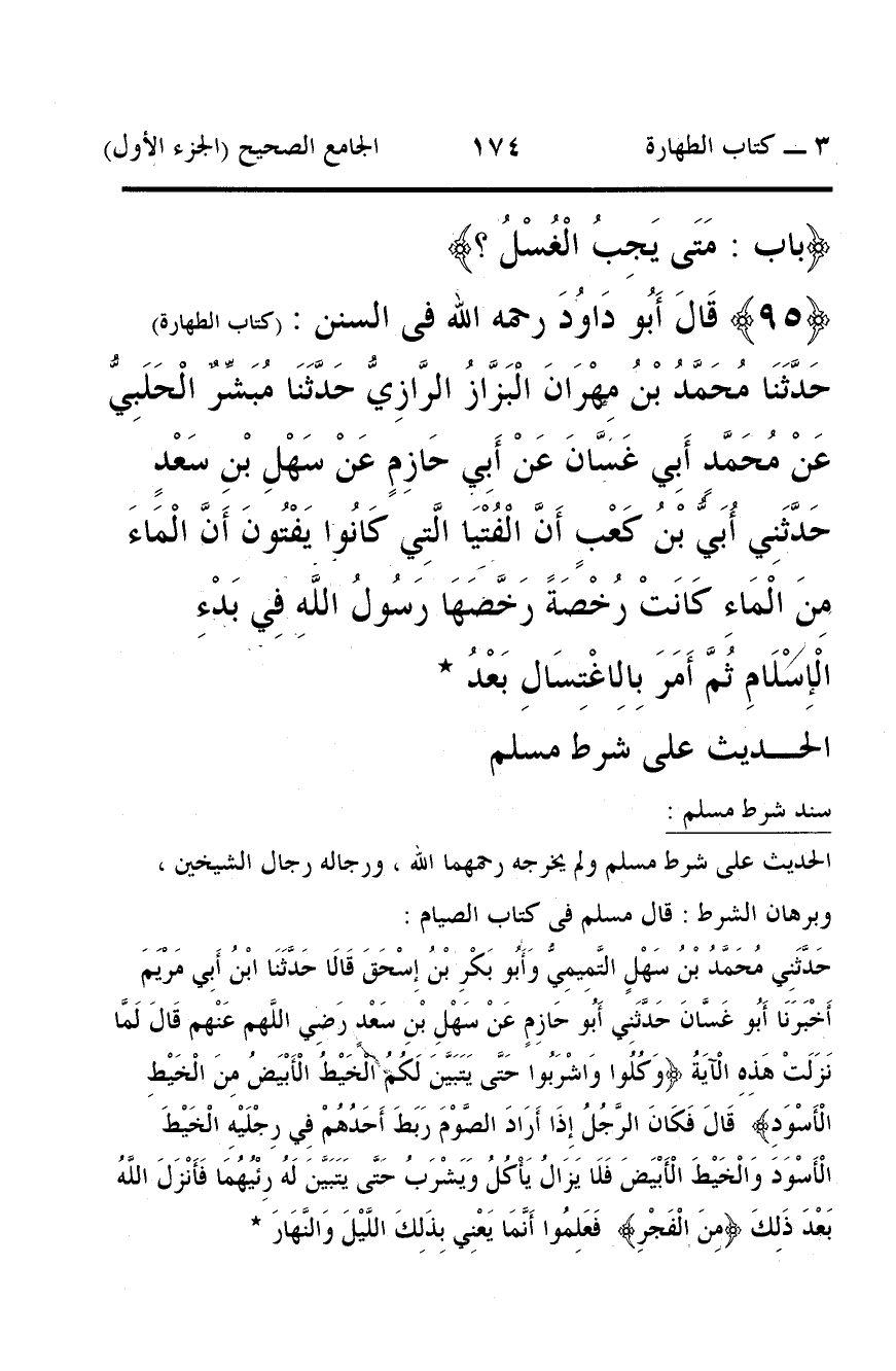 95 - قَالَ أَبُو دَاوُدَ رحمه الله فى السنن: (كتاب الطهارة) حَدَّثَنَا مُحَمَّدُ بْنُ مِهْرَانَ الْبَزَّازُ الرَّازِيُّ حَدَّثَنَا مُبَشِّرٌ الْحَلَبِيُّ عَنْ مُحَمَّدٍ أَبِي غَسَّانَ عَنْ أَبِي حَازِمٍ عَنْ سَهْلِ بْنِ سَعْدٍ حَدَّثَنِي أُبَيُّ بْنُ كَعْبٍ أَنَّ الْفُتْيَا الَّتِي كَانُوا يَفْتُونَ أَنَّ الْمَاءَ مِنَ الْمَاءِ كَانَتْ رُخْصَةً رَخَّصَهَا رَسُولُ اللَّهِ فِي بَدْءِ الْإِسْلَامِ ثُمَّ أَمَرَ بِالِاغْتِسَالِ بَعْدُ *