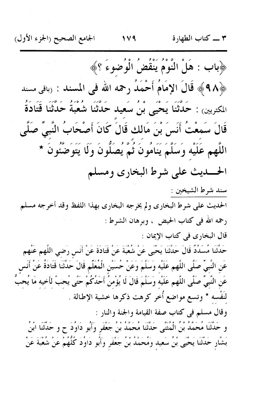 98 - قَالَ الإمَامُ أَحْمَدُ رحمه الله فى المسند: (باقى مسند المكثريين): حَدَّثَنَا يَحْيَى بْنُ سَعِيدٍ حَدَّثَنَا شُعْبَةُ حَدَّثَنَا قَتَادَةُ قَالَ سَمِعْتُ أَنَسَ بْنَ مَالِكٍ قَالَ كَانَ أَصْحَابُ النَّبِيِّ صَلَّى اللَّهم عَلَيْهِ وَسَلَّمَ يَنَامُونَ ثُمَّ يُصَلُّونَ وَلَا يَتَوَضَّئُونَ *