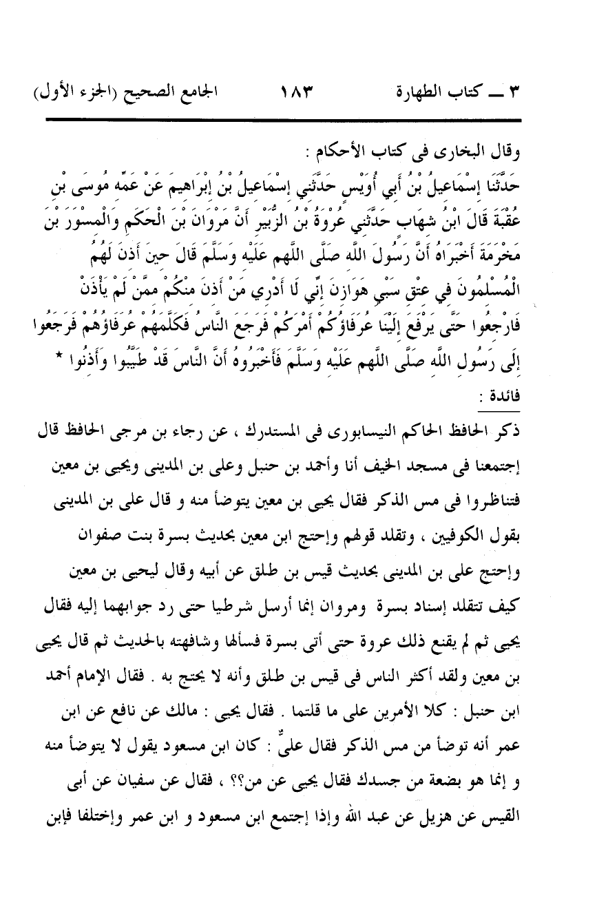 ذكر الحافظ الحاكم النيسابورى فى المستدرك، عن رجاء بن مرجى الحافظ قال إجتمعنا فى مسجد الخيف أنا وأحمد بن حنبل وعلى بن المدينى ويحيى بن معين فتناظروا فى مس الذكر فقال يحيى بن معين يتوضأ منه وقال على بن المدينى بقول الكوفيين، وتقلد قولهم وإحتج ابن معين بحديث بسرة بنت صفوان وإحتج على بن المدينى بحديث قيس بن طلق عن أبيه وقال ليحيى بن معين كيف تتقلد إسناد بسرة ومروان إنما أرسل شرطيا حتى رد جوابهما إليه فقال يحيى ثم لم يقنع ذلك عروة حتى أتى بسرة فسألها وشافهته بالحديث ثم قال يحيى بن معين ولقد أكثر الناس فى قيس بن طلق وأنه لا يحتج به. فقال الإمام أحمد ابن حنبل: كلا الأمرين على ما قلتما. فقال يحيى: مالك عن نافع عن ابن عمر أنه توضأ من مس الذكر فقال علىٌّ: كان ابن مسعود يقول لا يتوضأ منه وإنما هو بضعة من جسدك فقال يحيى عن من؟؟، فقال عن سفيان عن أبى القيس عن هزيل عن عبد الله وإذا إجتمع ابن مسعود وابن عمر وإختلفا فإبن