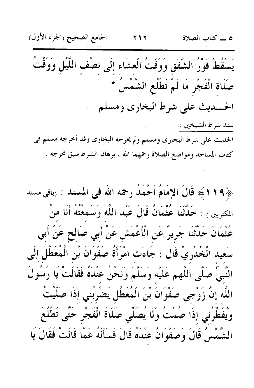 يَسْقُطْ فَوْرُ الشَّفَقِ وَوَقْتُ الْعِشَاءِ إِلَى نِصْفِ اللَّيْلِ وَوَقْتُ صَلَاةِ الْفَجْرِ مَا لَمْ تَطْلُعِ الشَّمْسُ *