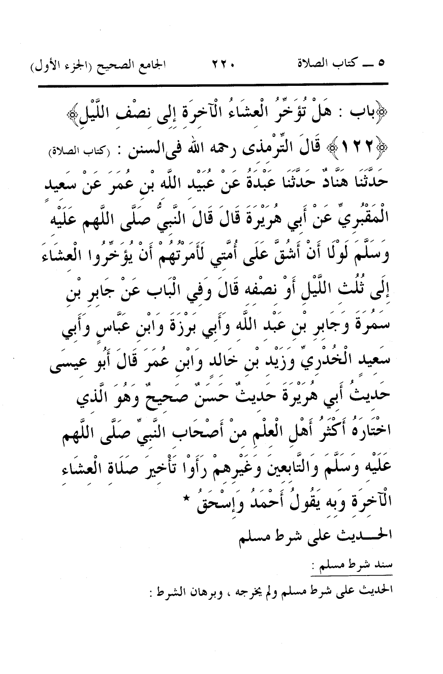 122 - قَالَ التِّرْمِذِى رحمه الله فى السنن: (كتاب الصلاة) حَدَّثَنَا هَنَّادٌ حَدَّثَنَا عَبْدَةُ عَنْ عُبَيْدِ اللَّهِ بْنِ عُمَرَ عَنْ سَعِيدٍ الْمَقْبُرِيِّ عَنْ أَبِي هُرَيْرَةَ قَالَ قَالَ النَّبِيُّ صَلَّى اللَّهم عَلَيْهِ