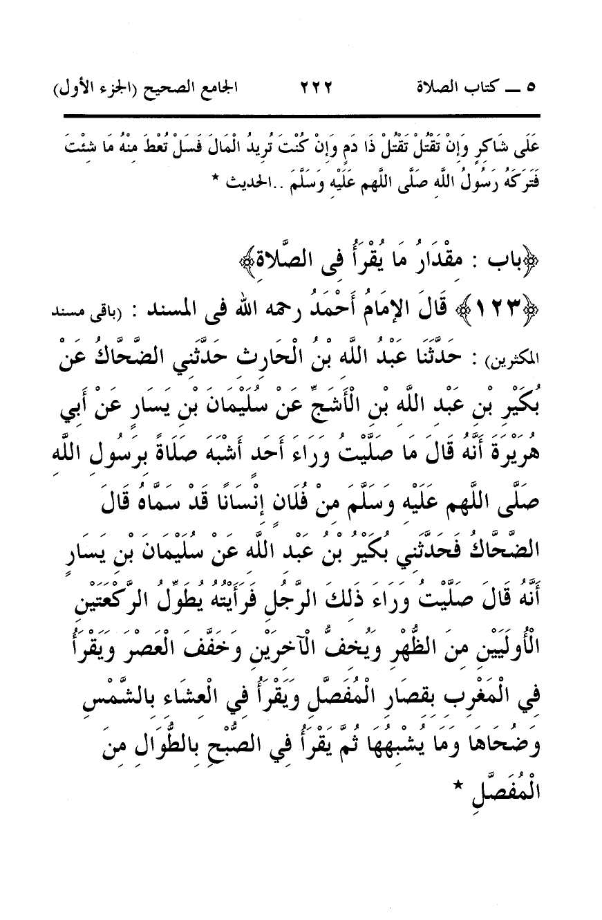 123 - قَالَ الإمَامُ أَحْمَدُ رحمه الله فى المسند: (باقى مسند المكثرين): حَدَّثَنَا عَبْدُ اللَّهِ بْنُ الْحَارِثِ حَدَّثَنِي الضَّحَّاكُ عَنْ بُكَيْرِ بْنِ عَبْدِ اللَّهِ بْنِ الْأَشَجِّ عَنْ سُلَيْمَانَ بْنِ يَسَارٍ عَنْ أَبِي هُرَيْرَةَ أَنَّهُ قَالَ مَا صَلَّيْتُ وَرَاءَ أَحَدٍ أَشْبَهَ صَلَاةً بِرَسُولِ اللَّهِ صَلَّى اللَّهم عَلَيْهِ وَسَلَّمَ مِنْ فُلَانٍ إِنْسَانًا قَدْ سَمَّاهُ قَالَ الضَّحَّاكُ فَحَدَّثَنِي بُكَيْرُ بْنُ عَبْدِ اللَّهِ عَنْ سُلَيْمَانَ بْنِ يَسَارٍ أَنَّهُ قَالَ صَلَّيْتُ وَرَاءَ ذَلِكَ الرَّجُلِ فَرَأَيْتُهُ يُطَوِّلُ الرَّكْعَتَيْنِ الْأُولَيَيْنِ مِنَ الظُّهْرِ وَيُخِفُّ الْآخِرَيْنِ وَخَفَّفَ الْعَصْرَ وَيَقْرَأُ فِي الْمَغْرِبِ بِقِصَارِ الْمُفَصَّلِ وَيَقْرَأُ فِي الْعِشَاءِ بِالشَّمْسِ وَضُحَاهَا وَمَا يُشْبِهُهَا ثُمَّ يَقْرَأُ فِي الصُّبْحِ بِالطُّوَالِ مِنَ الْمُفَصَّلِ *