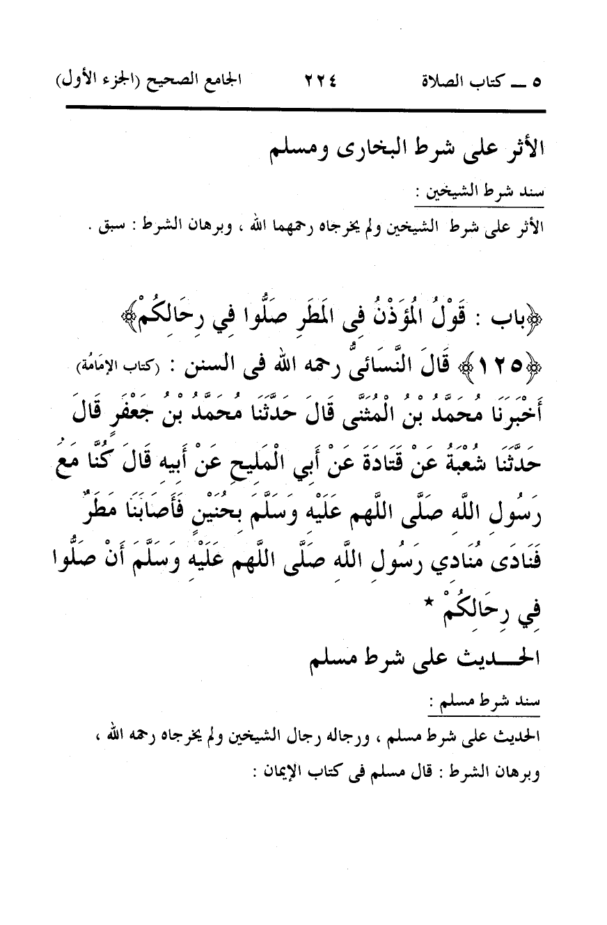 125 - قَالَ النَّسَائىُّ رحمه الله فى السنن: (كتاب الإمَامُة) أَخْبَرَنَا مُحَمَّدُ بْنُ الْمُثَنَّى قَالَ حَدَّثَنَا مُحَمَّدُ بْنُ جَعْفَرٍ قَالَ حَدَّثَنَا شُعْبَةُ عَنْ قَتَادَةَ عَنْ أَبِي الْمَلِيحِ عَنْ أَبِيهِ قَالَ كُنَّا مَعَ رَسُولِ اللَّهِ صَلَّى اللَّهم عَلَيْهِ وَسَلَّمَ بِحُنَيْنٍ فَأَصَابَنَا مَطَرٌ فَنَادَى مُنَادِي رَسُولِ اللَّهِ صَلَّى اللَّهم عَلَيْهِ وَسَلَّمَ أَنْ صَلُّوا فِي رِحَالِكُمْ *