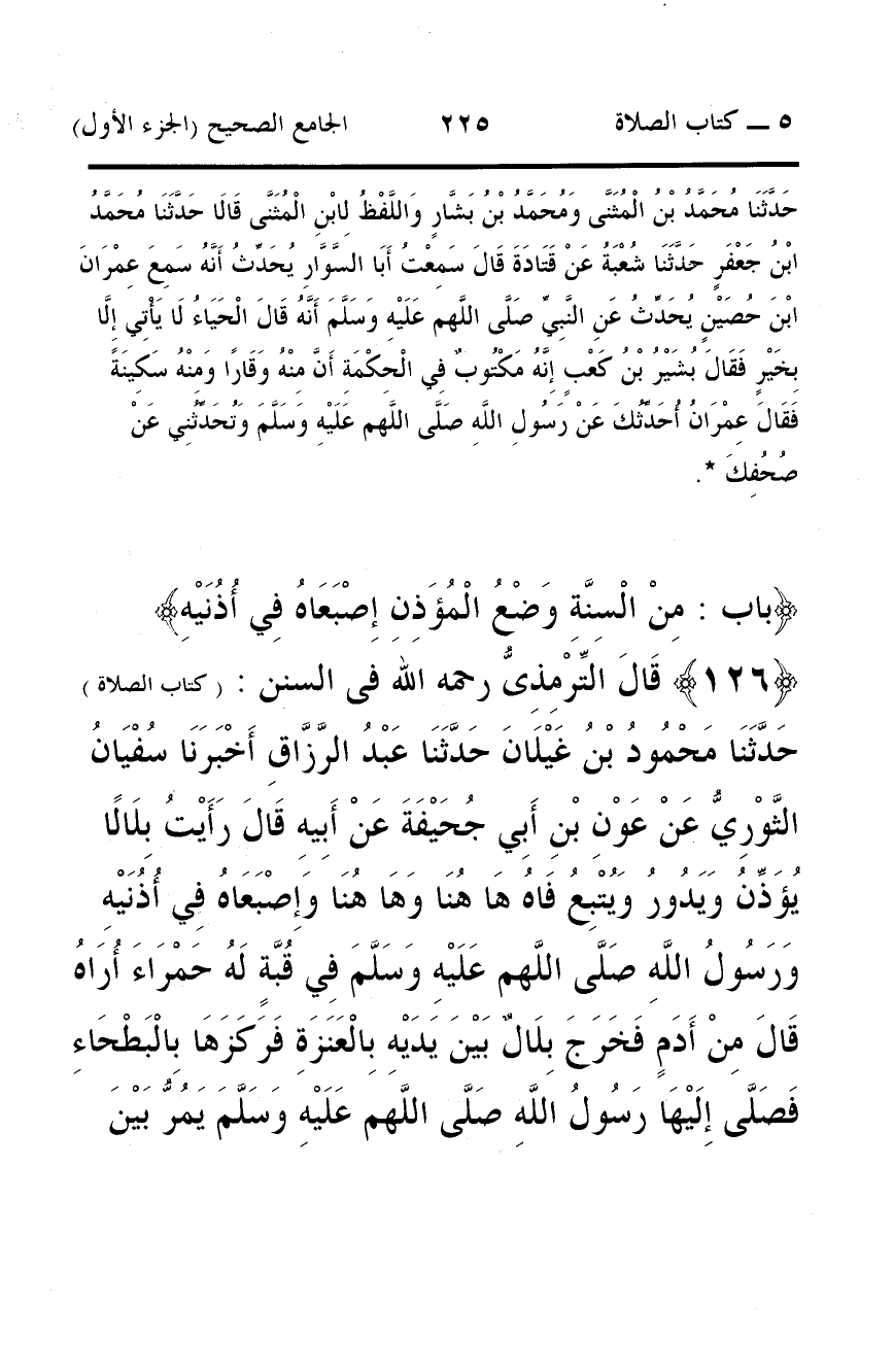 126 - قَالَ التِّرْمِذِىُّ رحمه الله فى السنن: (كتاب الصلاة) حَدَّثَنَا مَحْمُودُ بْنُ غَيْلَانَ حَدَّثَنَا عَبْدُ الرَّزَّاقِ أَخْبَرَنَا سُفْيَانُ الثَّوْرِيُّ عَنْ عَوْنِ بْنِ أَبِي جُحَيْفَةَ عَنْ أَبِيهِ قَالَ رَأَيْتُ بِلَالًا يُؤَذِّنُ وَيَدُورُ وَيُتْبِعُ فَاهُ هَا هُنَا وَهَا هُنَا وَإِصْبَعَاهُ فِي أُذُنَيْهِ وَرَسُولُ اللَّهِ صَلَّى اللَّهم عَلَيْهِ وَسَلَّمَ فِي قُبَّةٍ لَهُ حَمْرَاءَ أُرَاهُ قَالَ مِنْ أَدَمٍ فَخَرَجَ بِلَالٌ بَيْنَ يَدَيْهِ بِالْعَنَزَةِ فَرَكَزَهَا بِالْبَطْحَاءِ فَصَلَّى إِلَيْهَا رَسُولُ اللَّهِ صَلَّى اللَّهم عَلَيْهِ وَسَلَّمَ يَمُرُّ بَيْنَ