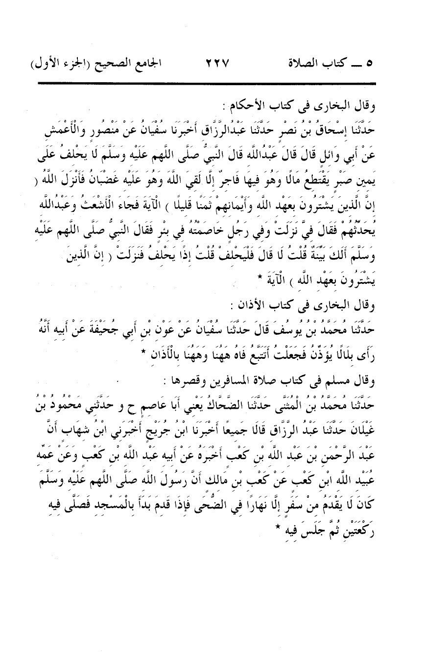 حَدَّثَنَا إِسْحَاقُ بْنُ نَصْرٍ حَدَّثَنَا عَبْدُالرَّزَّاقِ أَخْبَرَنَا سُفْيَانُ عَنْ مَنْصُورٍ وَالْأَعْمَشِ عَنْ أَبِي وَائِلٍ قَالَ قَالَ عَبْدُاللَّهِ قَالَ النَّبِيُّ صَلَّى اللَّهم عَلَيْهِ وَسَلَّمَ لَا يَحْلِفُ عَلَى يَمِينِ صَبْرٍ يَقْتَطِعُ مَالًا وَهُوَ فِيهَا فَاجِرٌ إِلَّا لَقِيَ اللَّهَ وَهُوَ عَلَيْهِ غَضْبَانُ فَأَنْزَلَ اللَّهُ (إِنَّ الَّذِينَ يَشْتَرُونَ بِعَهْدِ اللَّهِ وَأَيْمَانِهِمْ ثَمَنًا قَلِيلًا) الْآيَةَ فَجَاءَ الْأَشْعَثُ وَعَبْدُاللَّهِ يُحَدِّثُهُمْ فَقَالَ فِيَّ نَزَلَتْ وَفِي رَجُلٍ خَاصَمْتُهُ فِي بِئْرٍ فَقَالَ النَّبِيُّ صَلَّى اللَّهم عَلَيْهِ وَسَلَّمَ أَلَكَ بَيِّنَةٌ قُلْتُ لَا قَالَ فَلْيَحْلِفْ قُلْتُ إِذًا يَحْلِفُ فَنَزَلَتْ (إِنَّ الَّذِينَ يَشْتَرُونَ بِعَهْدِ اللَّهِ) الْآيَةَ *