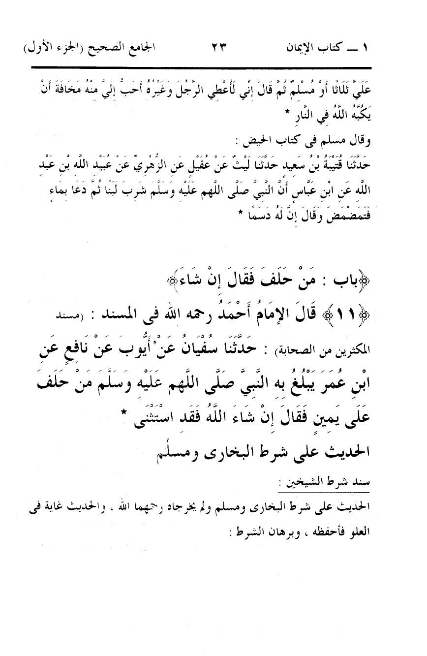 11 - قَالَ الإمَامُ أَحْمَدُ رحمه الله فى المسند: (مسند المكثرين من الصحابة): حَدَّثَنَا سُفْيَانُ عَنْ أَيُّوبَ عَنْ نَافِعٍ عَنِ ابْنِ عُمَرَ يَبْلُغُ بِهِ النَّبِيَّ صَلَّى اللَّهم عَلَيْهِ وَسَلَّمَ مَنْ حَلَفَ عَلَى يَمِينٍ فَقَالَ إِنْ شَاءَ اللَّهُ فَقَدِ اسْتَثْنَى *
