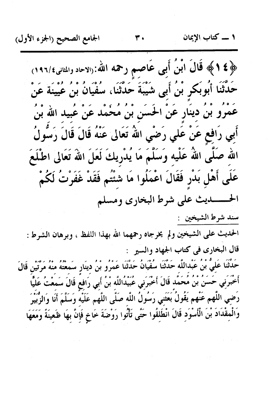 حَدَّثَنَا أبُوبَكرٍ بْنُ أَبِى شَيْبَةَ حَدَّثَنَا، سُفْيَانُ بْنُ عُيْينَة عَنْ عَمْرُو بْنُ دِينَارٍ عَنْ الحَسَنِ بْنُ مُحَمْد عَنْ عُبِيدِ اللهِ بْنُ أَبِي رَافِعٍ عَنْ عَلي رَضْي اللهُ تَعَالى عَنْهُ قَالَ قَالَ رَسُّولُ اللهِ صَلَّى اللهُ عَلْيهِ وَسَلَّمَ مَا يُدْرِيكَ لَعَلَ اللهَ تَعَالى اطْلَعَ عَلَى أَهْلِ بَدْرٍ فَقَالَ اعْمَلُوا مَا شِئْتُم فَقَدْ غَفَرْتُ لَكُمْ