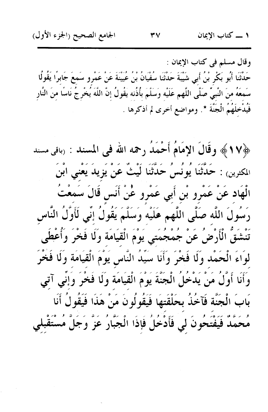17 - وقَالَ الإمَامُ أَحْمَدُ رحمه الله فى المسند: (باقى مسند المكثرين): حَدَّثَنَا يُونُسُ حَدَّثَنَا لَيْثٌ عَنْ يَزِيدَ يَعْنِي ابْنَ الْهَادِ عَنْ عَمْرِو بْنِ أَبِي عَمْرٍو عَنْ أَنَسٍ قَالَ سَمِعْتُ رَسُولَ اللَّهِ صَلَّى اللَّهم عَلَيْهِ وَسَلَّمَ يَقُولُ إِنِّي لَأَوَّلُ النَّاسِ تَنْشَقُّ الْأَرْضُ عَنْ جُمْجُمَتِي يَوْمَ الْقِيَامَةِ وَلَا فَخْرَ وَأُعْطَى لِوَاءَ الْحَمْدِ وَلَا فَخْرَ وَأَنَا سَيِّدُ النَّاسِ يَوْمَ الْقِيَامَةِ وَلَا فَخْرَ وَأَنَا أَوَّلُ مَنْ يَدْخُلُ الْجَنَّةَ يَوْمَ الْقِيَامَةِ وَلَا فَخْرَ وَإِنِّي آتِي بَابَ الْجَنَّةِ فَآخُذُ بِحَلْقَتِهَا فَيَقُولُونَ مَنْ هَذَا فَيَقُولُ أَنَا مُحَمَّدٌ فَيَفْتَحُونَ لِي فَأَدْخُلُ فَإِذَا الْجَبَّارُ عَزَّ وَجَلَّ مُسْتَقْبِلِي