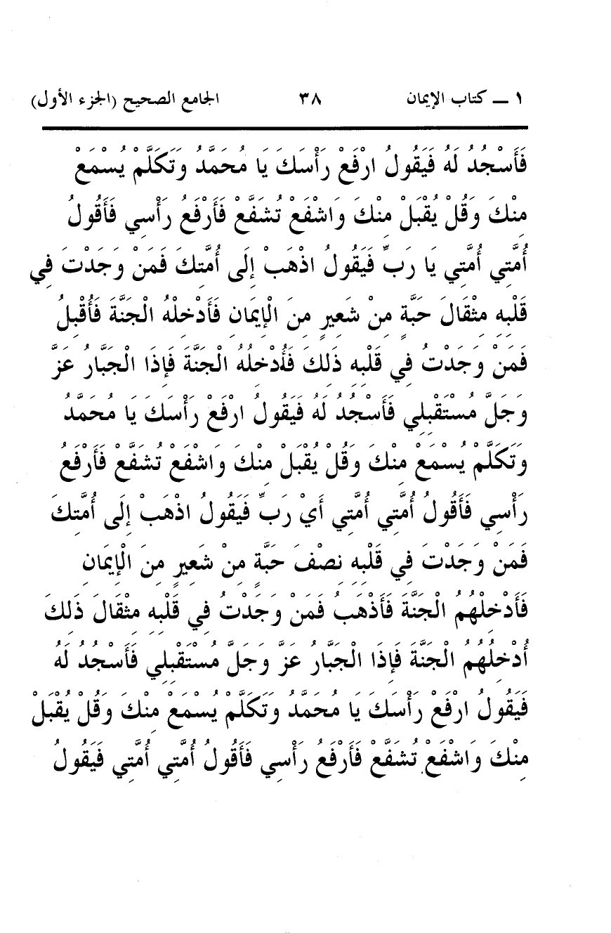 فَأَسْجُدُ لَهُ فَيَقُولُ ارْفَعْ رَاسَكَ يَا مُحَمَّدُ وَتَكَلَّمْ يُسْمَعْ مِنْكَ وَقُلْ يُقْبَلْ مِنْكَ وَاشْفَعْ تُشَفَّعْ فَأَرْفَعُ رَاسِي فَأَقُولُ أُمَّتِي أُمَّتِي يَا رَبِّ فَيَقُولُ اذْهَبْ إِلَى أُمَّتِكَ فَمَنْ وَجَدْتَ فِي قَلْبِهِ مِثْقَالَ حَبَّةٍ مِنْ شَعِيرٍ مِنَ الْإِيمَانِ فَأَدْخِلْهُ الْجَنَّةَ فَأُقْبِلُ فَمَنْ وَجَدْتُ فِي قَلْبِهِ ذَلِكَ فَأُدْخِلُهُ الْجَنَّةَ فَإِذَا الْجَبَّارُ عَزَّ وَجَلَّ مُسْتَقْبِلِي فَأَسْجُدُ لَهُ فَيَقُولُ ارْفَعْ رَاسَكَ يَا مُحَمَّدُ وَتَكَلَّمْ يُسْمَعْ مِنْكَ وَقُلْ يُقْبَلْ مِنْكَ وَاشْفَعْ تُشَفَّعْ فَأَرْفَعُ رَاسِي فَأَقُولُ أُمَّتِي أُمَّتِي أَيْ رَبِّ فَيَقُولُ اذْهَبْ إِلَى أُمَّتِكَ فَمَنْ وَجَدْتَ فِي قَلْبِهِ نِصْفَ حَبَّةٍ مِنْ شَعِيرٍ مِنَ الْإِيمَانِ فَأَدْخِلْهُمُ الْجَنَّةَ فَأَذْهَبُ فَمَنْ وَجَدْتُ فِي قَلْبِهِ مِثْقَالَ ذَلِكَ أُدْخِلُهُمُ الْجَنَّةَ فَإِذَا الْجَبَّارُ عَزَّ وَجَلَّ مُسْتَقْبِلِي فَأَسْجُدُ لَهُ فَيَقُولُ ارْفَعْ رَاسَكَ يَا مُحَمَّدُ وَتَكَلَّمْ يُسْمَعْ مِنْكَ وَقُلْ يُقْبَلْ مِنْكَ وَاشْفَعْ تُشَفَّعْ فَأَرْفَعُ رَاسِي فَأَقُولُ أُمَّتِي أُمَّتِي فَيَقُولُ