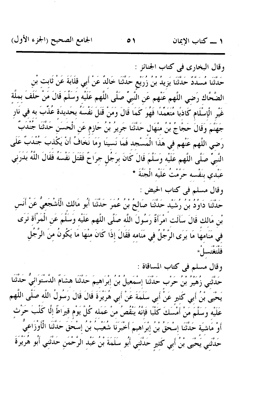 حَدَّثَنَا مُسَدَّدٌ حَدَّثَنَا يَزِيدُ بْنُ زُرَيْعٍ حَدَّثَنَا خَالِدٌ عَنْ أَبِي قِلَابَةَ عَنْ ثَابِتِ بْنِ الضَّحَّاكِ رَضِي اللَّهم عَنْهم عَنِ النَّبِيِّ صَلَّى اللَّهم عَلَيْهِ وَسَلَّمَ قَالَ مَنْ حَلَفَ بِمِلَّةٍ غَيْرِ الْإِسْلَامِ كَاذِبًا مُتَعَمِّدًا فَهُوَ كَمَا قَالَ وَمَنْ قَتَلَ نَفْسَهُ بِحَدِيدَةٍ عُذِّبَ بِهِ فِي نَارِ جَهَنَّمَ وَقَالَ حَجَّاجُ بْنُ مِنْهَالٍ حَدَّثَنَا جَرِيرُ بْنُ حَازِمٍ عَنِ الْحَسَنِ حَدَّثَنَا جُنْدَبٌ رَضِي اللَّهم عَنْهم فِي هَذَا الْمَسْجِدِ فَمَا نَسِينَا وَمَا نَخَافُ أَنْ يَكْذِبَ جُنْدَبٌ عَلَى النَّبِيِّ صَلَّى اللَّهم عَلَيْهِ وَسَلَّمَ قَالَ كَانَ بِرَجُلٍ جِرَاحٌ فَقَتَلَ نَفْسَهُ فَقَالَ اللَّهُ بَدَرَنِي عَبْدِي بِنَفْسِهِ حَرَّمْتُ عَلَيْهِ الْجَنَّةَ *